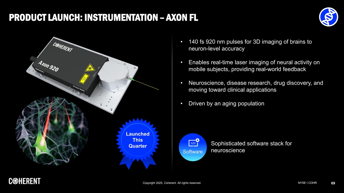 Product Launch:Instrumentation – AXON FL Picture • 140 fs 920 nm脉冲,用于大脑的3D成像,达到神经元级别的精确度•能够对移动对象的神经活动进行实时激光成像,提供真实世界的反馈•神经科学、疾病研究、药物发现,并走向临床应用•在人口老龄化的推动下,为Quarter Neuroscience Software Copyright 2025,Coherent推出了这个复杂的软件堆栈。版权所有。NYSE I COHR 69