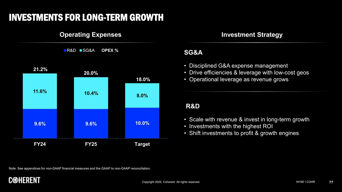 毛利率扩张毛利率扩张策略产品销量> 42% •销量增加带来的吸收改善是顺风•混合成本价格定价优化带来的潜在逆风37.9% Vol •新的定价工具和分析•产品供应的深度和广度成本降低•效率和产量的运营改善•固定成本和间接费用减少25财年目标注:非公认会计准则毛利率。有关非GAAP财务指标和GAAP与非GAAP对账,请参见附录。版权所有2025,连贯一致。版权所有。NYSE I COHR 76