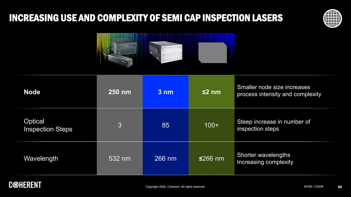 SEMI CAP检查激光器的使用增加和复杂性更小的节点尺寸增加节点250nm 3 nm ≤ 2nm工艺强度和复杂性光学陡峭化增加数量385100 +检查步骤检查步骤更短的波长波长532nm 266nm ≤ 266nm增加复杂性Copyright 2025,Coherent。版权所有。NYSE I COHR 60