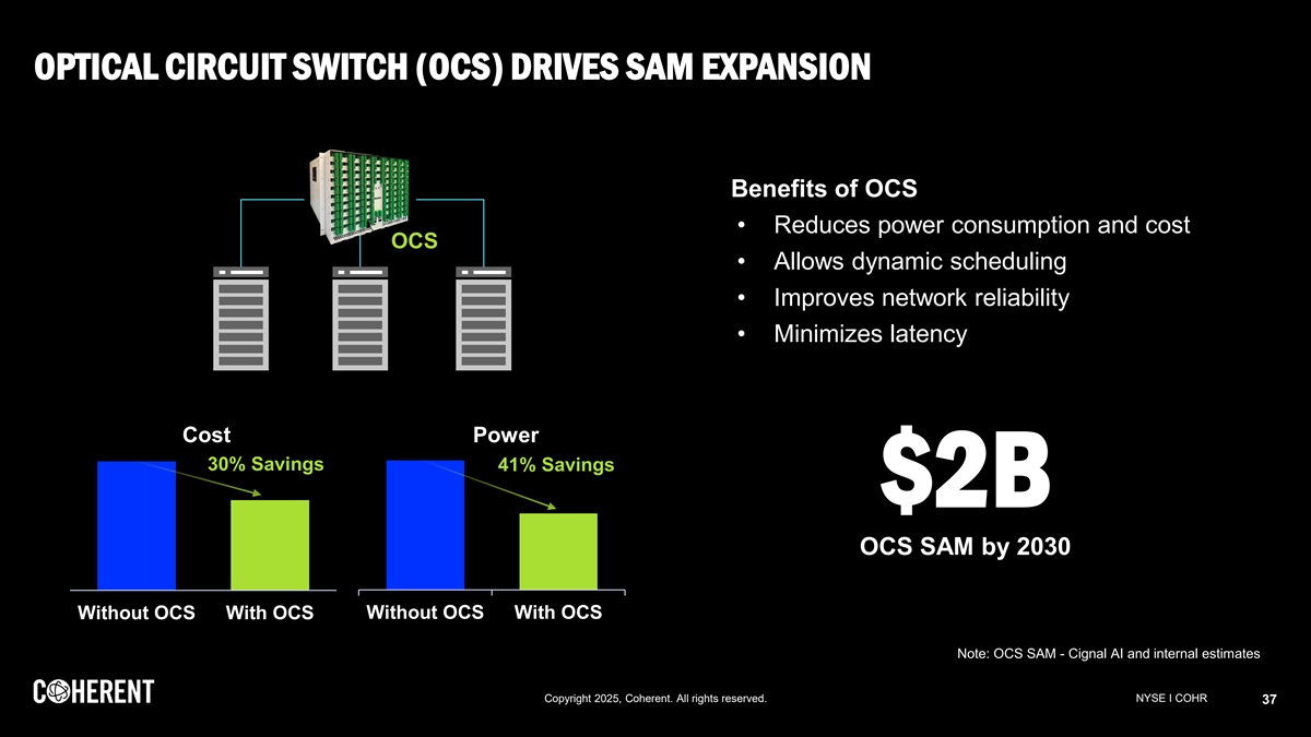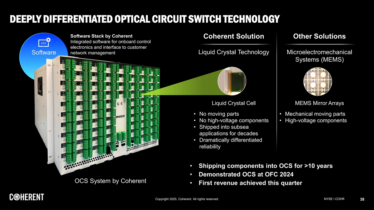 光学电路开关(OCS)驱动OCS的SAM扩展优势•降低功耗和成本OCS •允许动态调度•提高网络可靠性•最大限度地减少延迟成本功耗30%节省41%到2030年节省$ 2B的OCS SAM没有OCS有OCS没有OCS有OCS注:OCS SAM-Cignal AI和内部估计版权所有2025,连贯一致。版权所有。NYSE I COHR 37