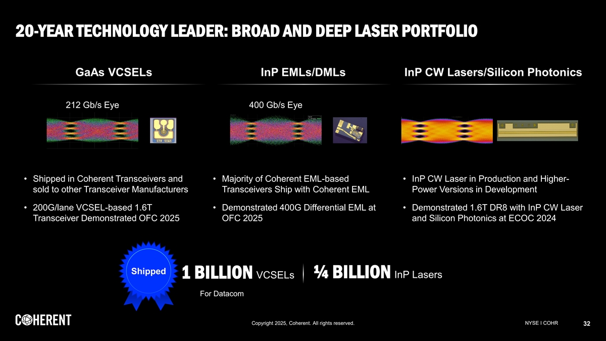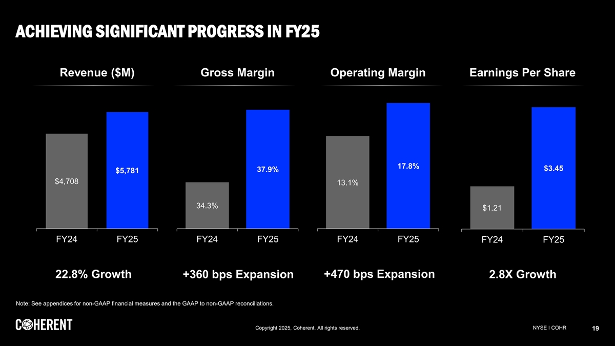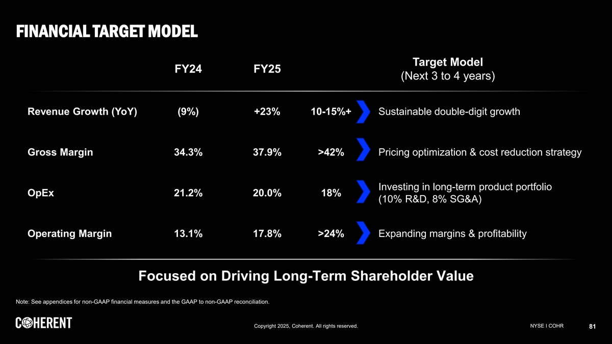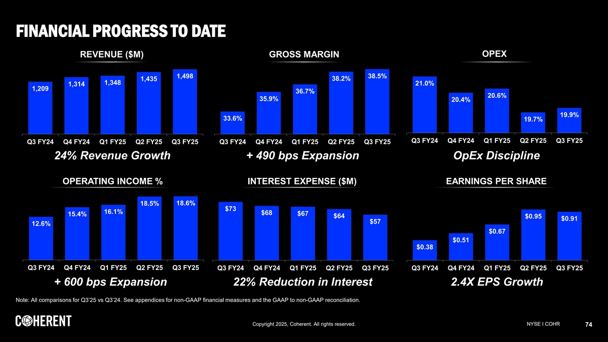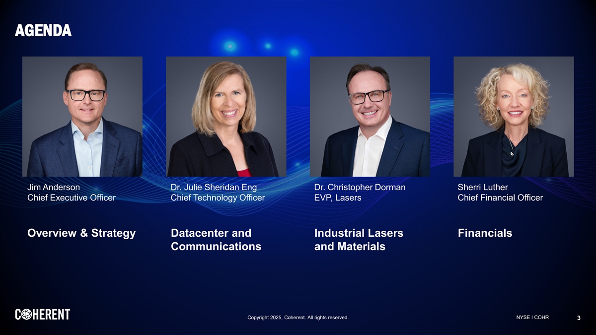 前瞻性陈述本演示文稿包含与未来事件和预期相关的前瞻性陈述,包括我们对以下方面的预期:(i)我们所服务的市场的增长,包括但不限于数据中心和通信以及工业激光器和材料市场;(ii)我们的供应链弹性以及组装和测试能力的增长,激光器件产能和我们的快速爬坡能力;(iii)收入增长和该增长的驱动因素;(iv)数据中心光互连增长;(v)新数据速率的采用周期持续加快;(vi)由光电路开关(“OCS”)驱动的SAM扩张;(vii)某些类型的OCS的生产时机;(viii)数据中心互连收发器的增长;(ix)传输设备市场的增长;(x)工业领域的市场机会,包括但不限于精密制造领域的市场机会;半帽和显示盖;仪器仪表和其他;以及汽车和能源;(xi)我们工业终端市场的关键增长动力、我们的工业增长和工业市场增长;(xii)精密制造领域激光含量的增加;(xiii)显示市场的增长,包括但不限于OLED面积增长和采用microLED;(xiv)健康科学市场的增长;(xv)经常性服务收入流的扩大;(xvi)收入增长;毛利率扩张;投资;盈利能力增长;资产负债表得到加强,包括但不限于通过降低债务杠杆;前进资本配置策略;财务目标包括但不限于同比收入增长、毛利率、运营费用和运营利润率;以及关税对我们业务的影响,每一项都是基于某些假设和意外情况。这些前瞻性陈述是根据1995年美国私人证券诉讼改革法案的安全港条款作出的,与公司未来的业绩相关。本投资者报告中的前瞻性陈述涉及风险和不确定性,可能导致实际结果、业绩或趋势与本文前瞻性陈述或先前披露中表达的内容存在重大差异。该公司认为,其在本演示文稿中所做的所有前瞻性陈述都有合理的依据,但无法保证管理层的预期、信念或前瞻性陈述中所表达的预测将实际发生或被证明是正确的。除了一般行业和全球经济状况外,可能导致实际结果与本演示文稿中的前瞻性陈述中讨论的结果存在重大差异的因素还包括但不限于:(i)本文所述的任何一项或多项假设未能被证明是正确的;(ii)公司在收购Coherent, Inc.(“交易”)时的债务条款和偿还此类债务的能力,(iii)与未来整合和/或重组行动有关的风险;(iv)客户和最终用户的采购模式波动;(v)公司留住和雇用关键员工的能力;(vi)公司终端市场的需求变化以及公司应对此类市场变化的能力;(vii)新产品的及时发布和市场对此类新产品的接受程度;(viii)竞争对手推出新产品和其他竞争性反应;(ix)公司吸收其他近期收购的业务,并实现协同效应、成本节约的能力,以及与此相关的增长机会,以及与此类收购相关的风险、成本和不确定性;(x)实现创新的研发和商业化投资收益的风险;(xi)公司股价与工业技术领导者交易不一致的风险;(xii)贸易保护措施的影响,例如美国的进口关税或其他国家采取的报复行动;和/或(xiii)与前瞻性陈述相关的风险以及我们在提交给美国证券交易委员会(“SEC”)的文件中不时确定的其他“风险因素”,包括我们截至2024年6月30日的财政年度的10-K表格年度报告,以及我们随后提交的10-Q表格季度报告,这些文件可从SEC获得。公司不承担更新这些前瞻性陈述中包含的信息的任何义务,无论是由于新信息、未来事件或发展,或其他原因。除非本演示文稿中另有说明,本演示文稿中的所有信息截至5月28日, 2025.本演示文稿包含非GAAP财务指标和与公司过去业绩相关的关键指标。我们认为,这些非公认会计准则财务指标的表述增强了投资者对我们历史财务业绩的整体理解,并有助于投资者比较我们在报告期内的业绩表现。这些非GAAP财务指标是根据美国公认会计原则编制的财务业绩指标的补充,而不是替代或优于这些指标。使用这些非GAAP财务指标与其最接近的GAAP等值指标相比存在许多限制。例如,其他公司可能会以不同的方式计算非GAAP财务指标,或者可能会使用其他指标来评估其业绩,所有这些都可能降低我们的非GAAP财务指标作为比较工具的有用性。根据G条例的要求,我们在标题为“GAAP与NON-GAAP对账”的部分中提供了这些措施与最直接可比的GAAP措施的对账。该公司没有提供前瞻性非GAAP毛利率百分比、非GAAP运营支出百分比、非GAAP运营利润率百分比和非GAAP每股收益的量化对账,因为如果没有不合理的努力,我们无法预测制定可比GAAP衡量标准所需的某些项目。这些项目包括但不限于重组费用;整合、场地整合等费用;汇兑收益(损失);基于股份的补偿费用。这些项目的可变性可能会对我们未来的GAAP财务业绩产生重大影响,我们认为,纳入任何此类对账将意味着程度或精确度,可能会对投资者造成混淆或误导。版权所有2025,连贯一致。版权所有。NYSE I COHR 2