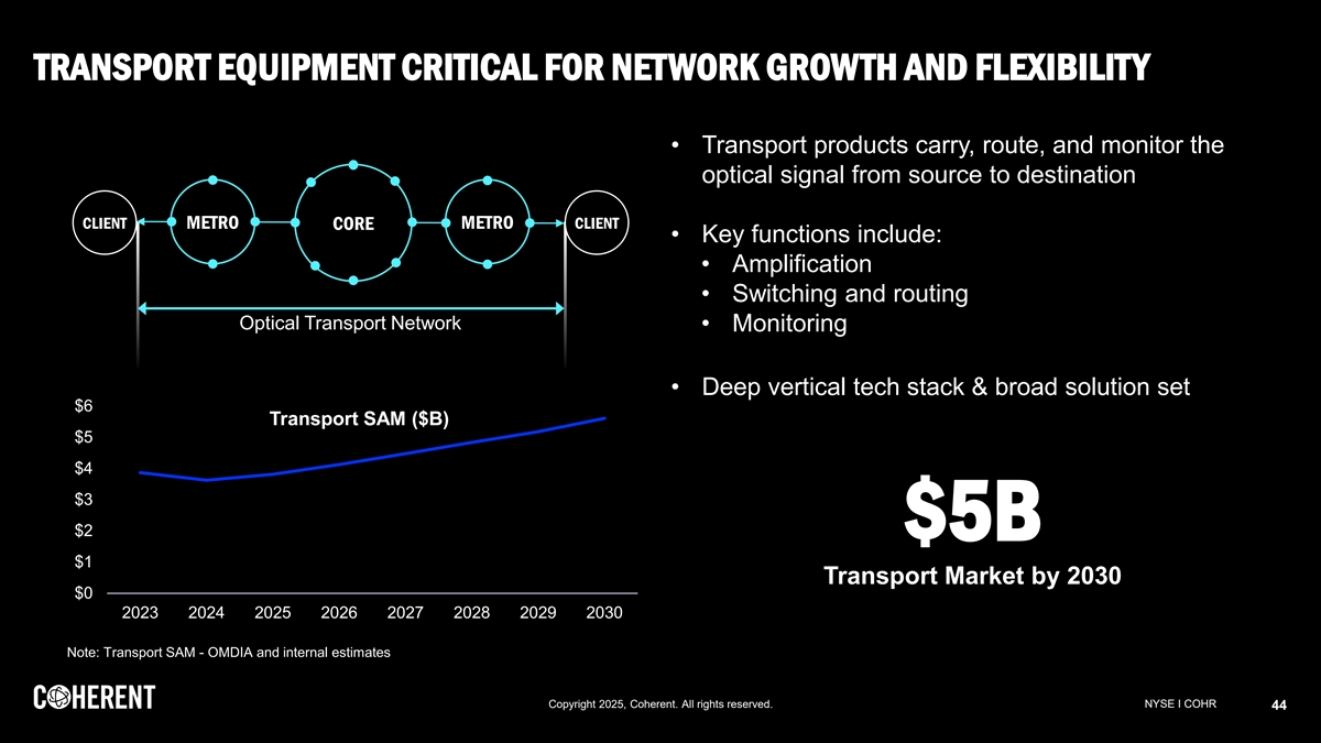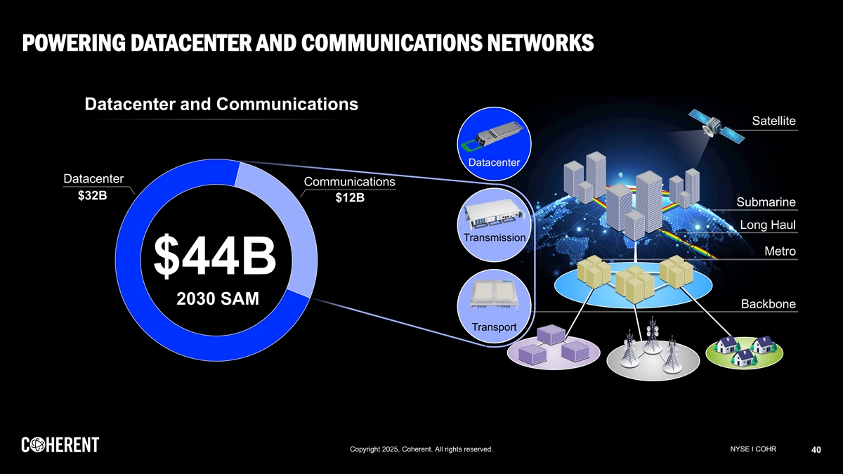 POWERing DATACENTER and Communications Network Datacenter and Communications Satellite Datacenter Datacenter Communications $ 32B $ 12B Submarine Long Haul Transmission Metro $ 44B 2030 SAM Backbone Transport Copyright 2025,Coherent。版权所有。NYSE I COHR 25