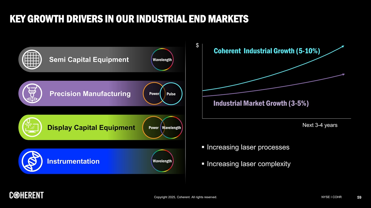我们工业终端市场的关键增长驱动因素$相干工业增长(5-10 %)波长半导体资本设备功率脉冲精密制造工业市场增长(3-5 %)未来3-4年功率波长显示资本设备§增加激光工艺波长仪表§增加激光复杂性版权所有2025,相干。版权所有。NYSE I COHR 5 9