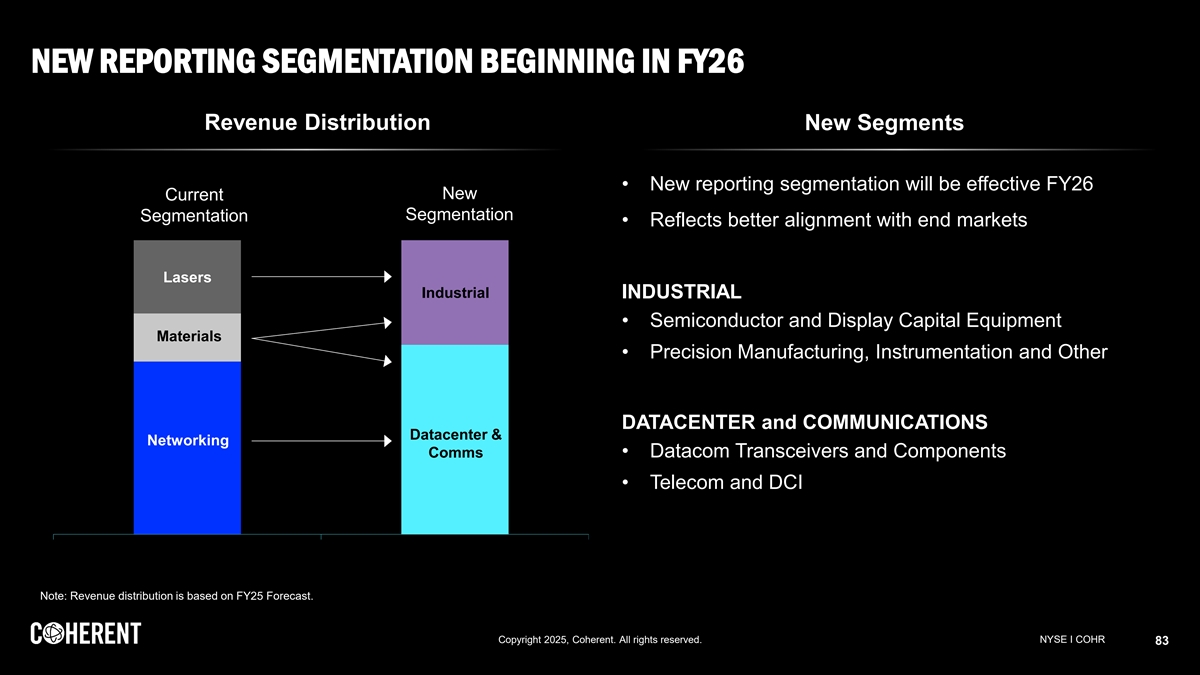 26财年开始的新报告分部收入分配新分部•新报告分部将生效26财年新电流分部分部•反映与终端市场更好的一致性激光工业•半导体和显示资本设备材料•精密制造、仪器仪表和其他数据中心和通信数据中心和网络通信•数据通信收发器和组件•电信和DCI当前新注:收入分配基于25财年预测。版权所有2025,连贯一致。版权所有。NYSE I COHR 83