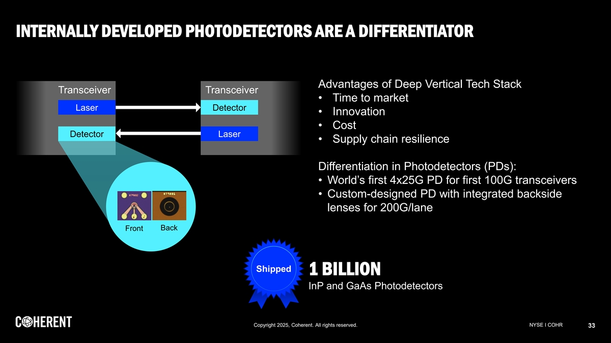 内部开发的光电探测器是深度垂直技术堆栈收发器收发器的差异化优势•激光探测器上市时间•创新•成本探测器激光器•光电探测器(PD)中的供应链弹性差异化:•全球首个用于首个100G收发器的4x25G PD •为200g/车道后前置提供集成背面镜头的定制设计PD出货10亿InP和GaAs光电探测器版权所有2025,连贯一致。版权所有。NYSE I COHR 33