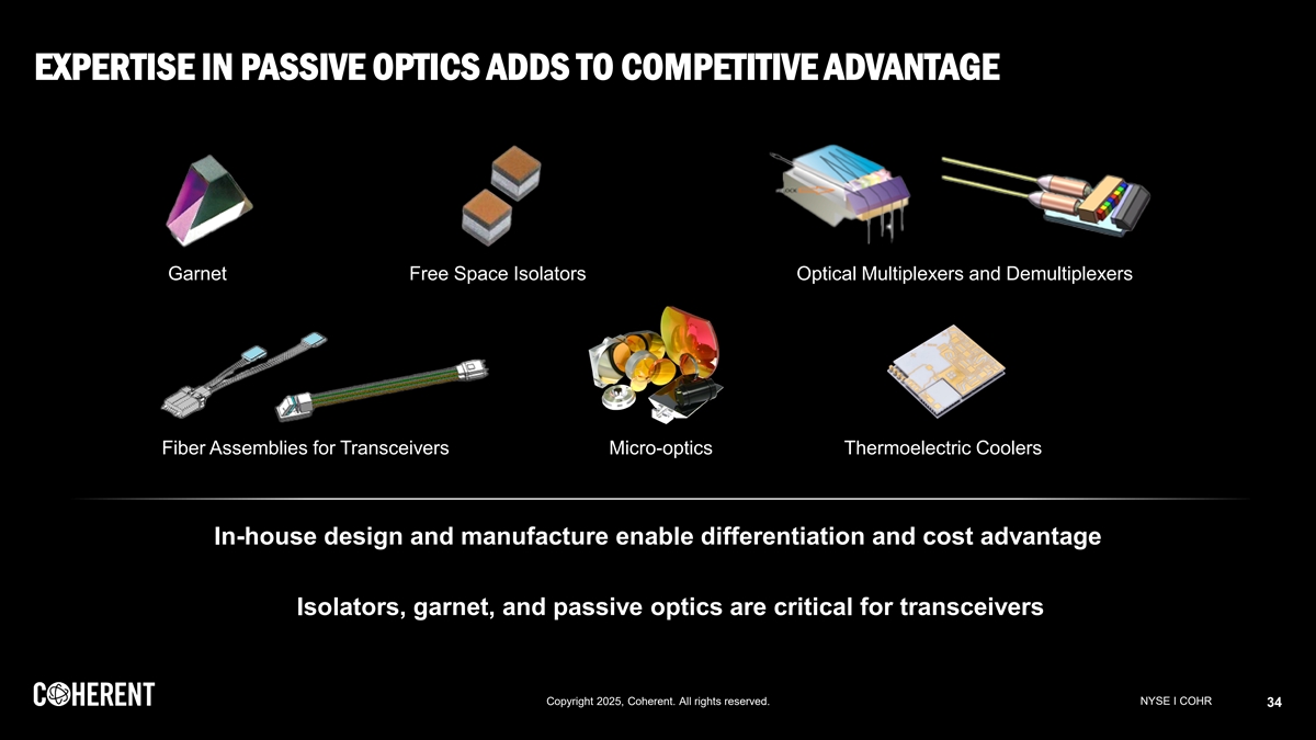 无源光学方面的专业知识增加了竞争优势无石榴石空间隔离器光学多路复用器和多路复用器光纤组件用于收发器的微型光学热电冷却器内部设计和制造可实现差异化和成本优势隔离器、石榴石和无源光学对收发器至关重要版权所有2025,连贯一致。版权所有。NYSE I COHR 34