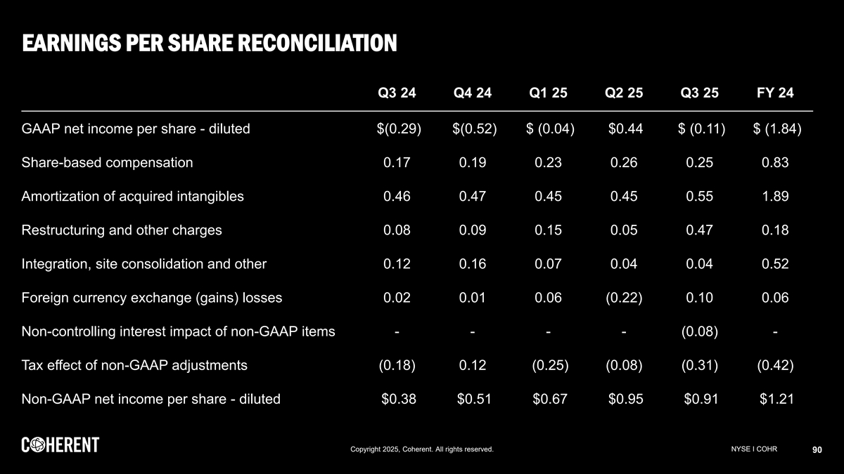 每股收益调节Q3 24 Q4 24 Q1 25 Q2 25 Q3 25 FY 24 GAAP每股净收益-摊薄$(0.29)$(0.52)$(0.04)$ 0.44 $(0.11)$(1.84)股份补偿0.17 0.190.23 0.26 0.25 0.83已购无形资产摊销0.46 0.47 0.45 0.45 0.55 1.89重组及其他费用0.08 0.09 0.15 0.05 0.47 0.18整合,网站合并及其他0.12 0.16 0.07 0.04 0.04 0.52外币汇兑(收益)损失0.02 0.01 0.06(0.22)0.10 0.06非公认会计原则项目的非控股权益影响----(0.08)-非公认会计原则调整的税收影响(0.18)0.12(0.25)(0.08)(0.31)(0.42)非公认会计原则每股净收益-稀释后0.38美元0.51美元0.67美元0.95美元0.91美元1.21美元版权所有2025,连贯一致。版权所有。NYSE I COHR 90