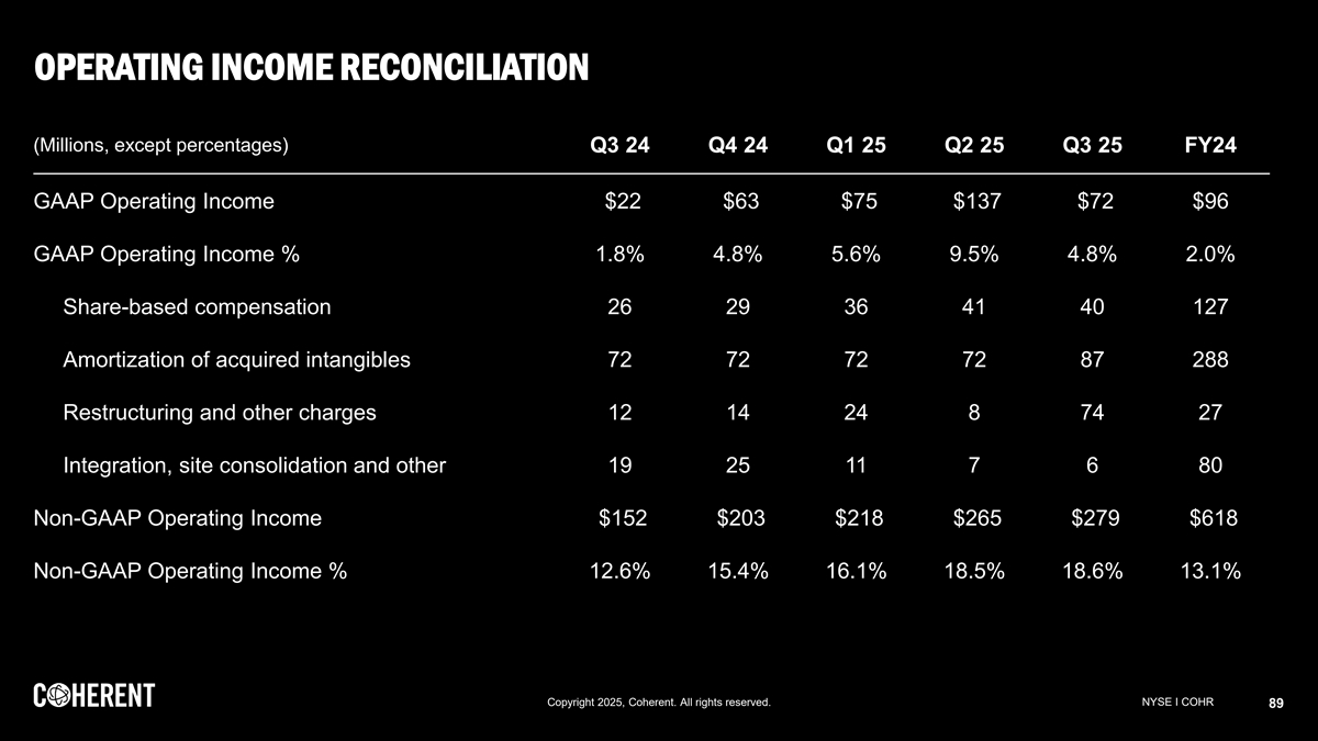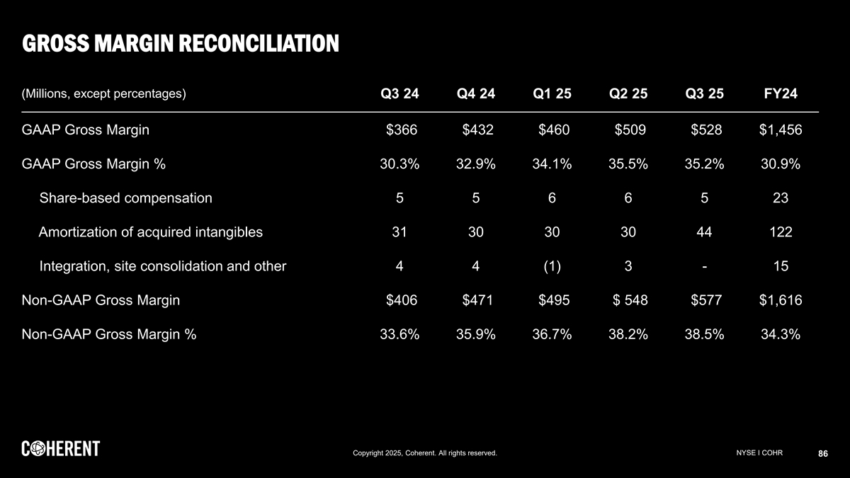 附录:GAAP与NON-GAAP的对账这些幻灯片上的非GAAP财务指标包括毛利率、营业费用百分比、营业利润率、营业收入百分比和每股收益。有关GAAP与非GAAP对账,请参见附录。信用协议定义的债务杠杆率,不包括可转换优先股。季度数据的所有比较均为Q3’25 vs Q3’24。25财年是Q1至Q3实际值加上Q4指引中点。该公司不提供前瞻性非公认会计原则措施的对账。如果没有不合理的努力,该公司无法预测制定与这一前瞻性数字相当的有意义的GAAP财务指标所需的某些项目。版权所有2025,连贯一致。版权所有。NYSE I COHR 85