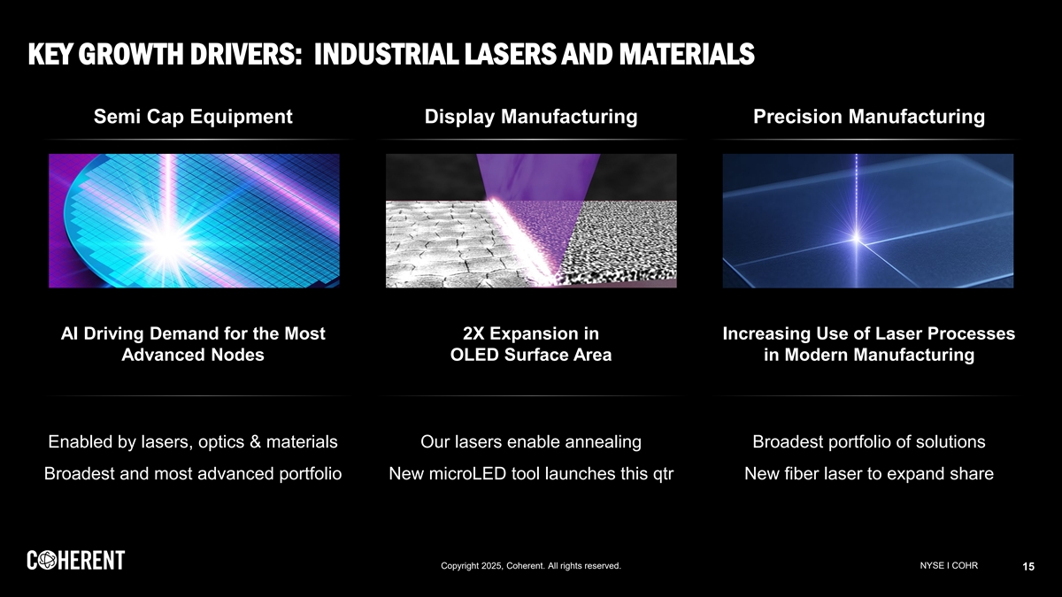 关键增长驱动因素:工业激光器和材料Semi Cap设备显示制造精密制造AI推动对激光工艺使用增加的最大2倍扩展的需求先进节点OLED表面面积在激光、光学和材料支持的现代制造中我们的激光器可实现退火最广泛的解决方案组合最广泛和最先进的组合新的microLED工具推出这款qtr新光纤激光器以扩大份额版权所有2025,连贯一致。版权所有。NYSE I COHR 15