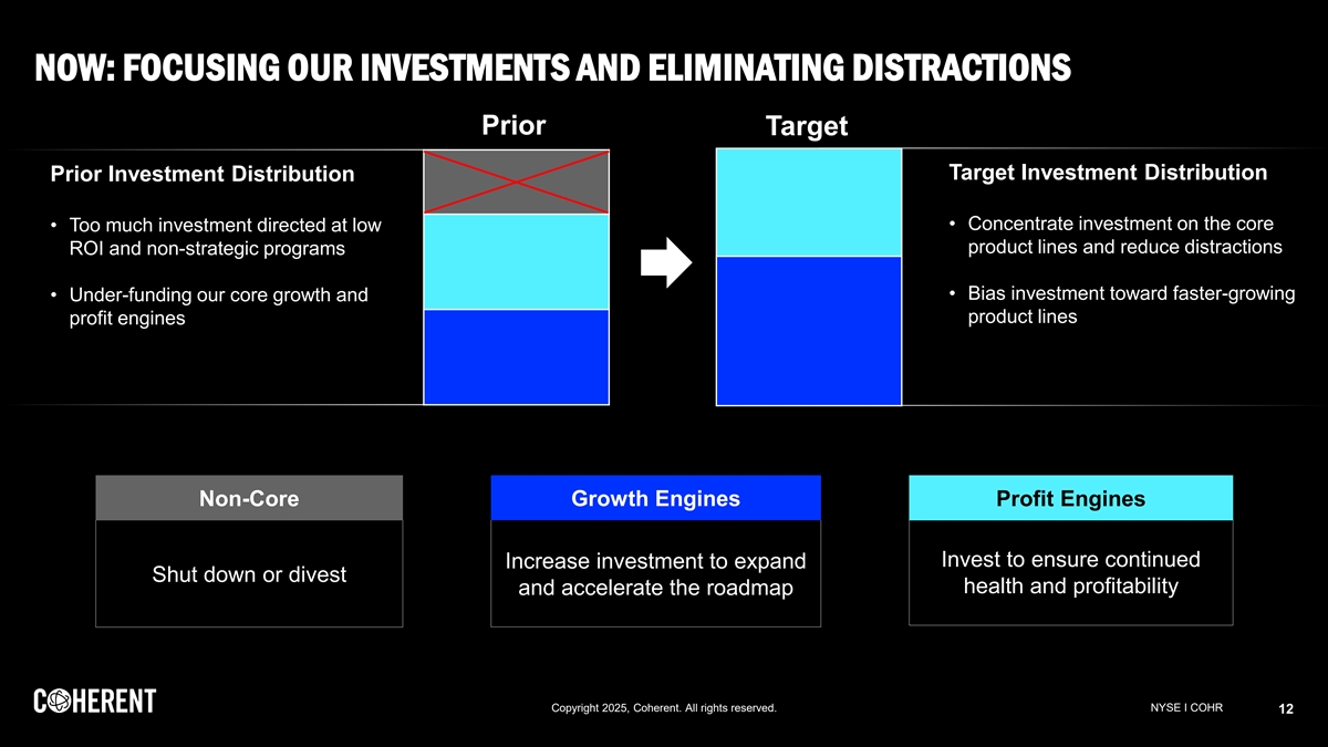 Now:聚焦我们的投资并消除分心的先前目标目标投资分配先前投资分配•将投资集中在核心•过多的投资针对低产品线,减少干扰ROI和非战略计划•偏向于更快增长的投资•为我们的核心增长和产品线利润引擎非核心增长引擎提供资金不足利润引擎投资,以确保持续增加投资以扩大关闭或剥离健康和盈利能力,并加速路线图版权所有2025,连贯一致。版权所有。NYSE I COHR 12