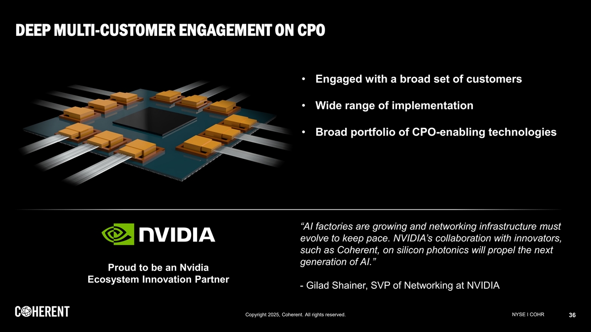 深度多客户参与CPO •与广泛的客户群开展合作•广泛的实施范围•广泛的CPO支持技术组合“人工智能工厂正在成长,网络基础设施必须不断发展以跟上步伐。英伟达与Coherent等创新者在硅光子方面的合作将推动下一代人工智能。”自豪地成为英伟达生态系统创新合作伙伴-Gilad Shainer,NVIDIA版权2025网络高级副总裁,Coherent。版权所有。NYSE I COHR 36
