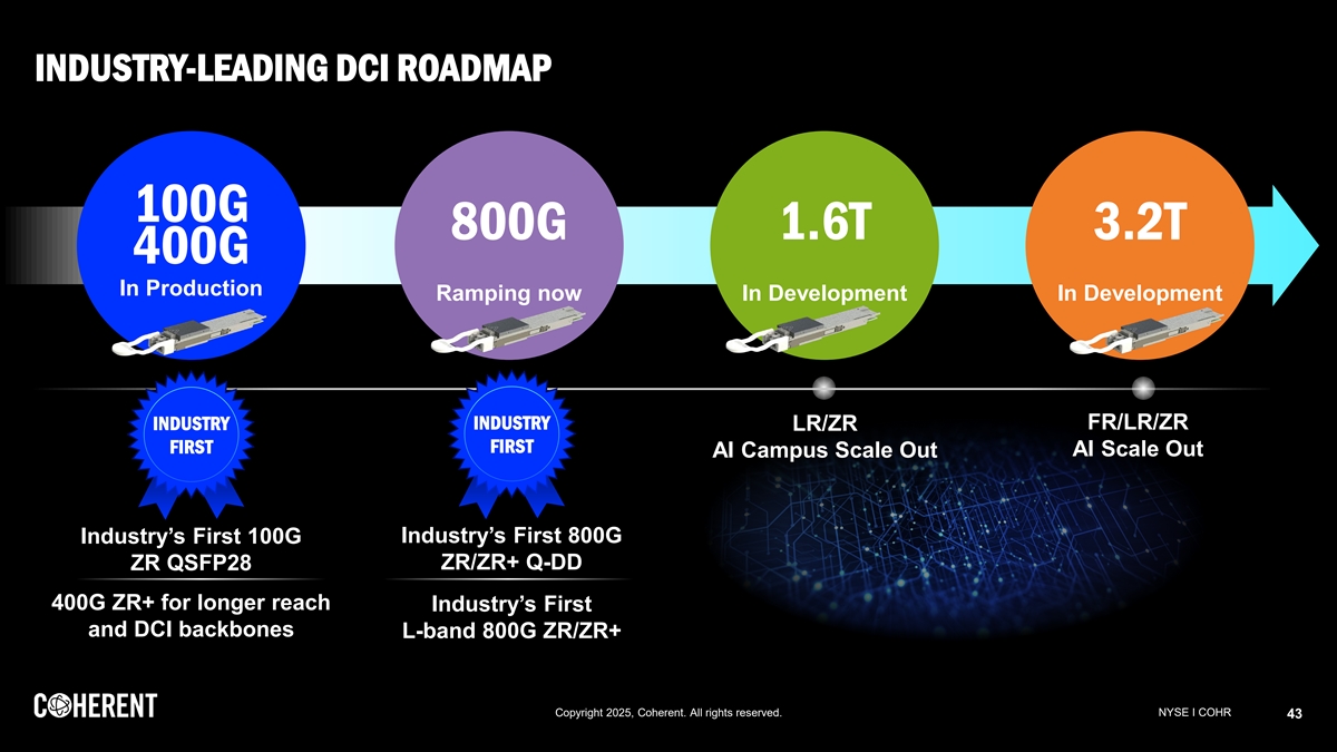 差异化和市场时间领先通过内部技术多年领先由于内部InP技术100G ZR QSFP28收发器•业界首个100G ZR QSFP28收发器•由新型低功耗InP可调谐激光器支持的专用电源优化可调谐激光器首次在800G ZR/ZR + QSFP-DD上上市•由市场领先的InP光子集成电路(PIC)技术支持复杂的InP PIC设计和制造• InP PIC技术通过C & L波段版权所有2025的相干解决方案实现功率和成本效益,相干。版权所有。NYSE I COHR 42