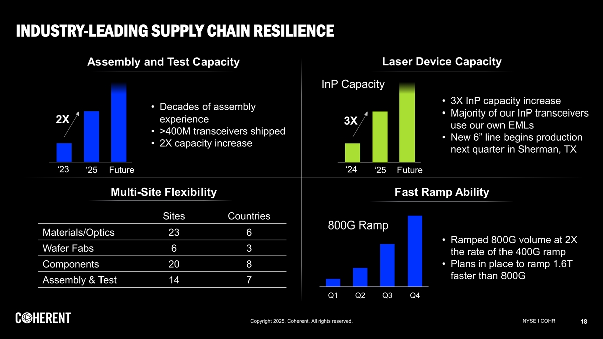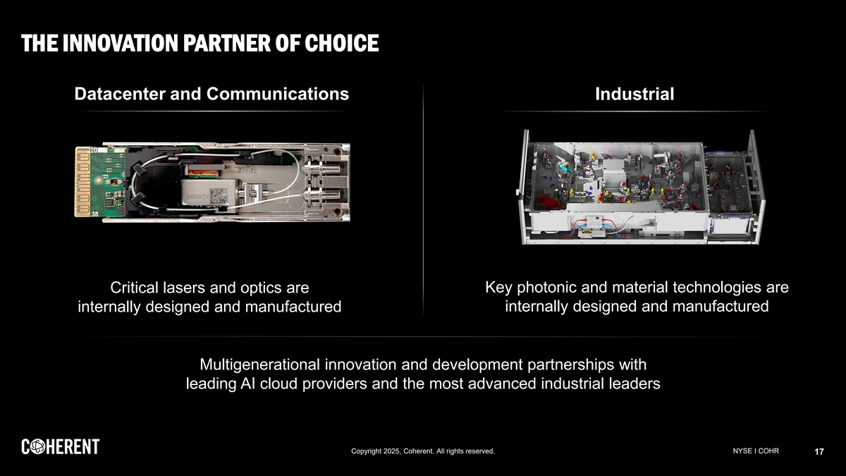 CHOICE数据中心和通信的创新合作伙伴工业关键激光器和光学是关键光子和材料技术的内部设计和制造内部设计和制造与领先的AI云提供商和最先进的工业领导者建立的多代创新和发展合作伙伴关系版权所有2025,Coherent。版权所有。NYSE I COHR 17