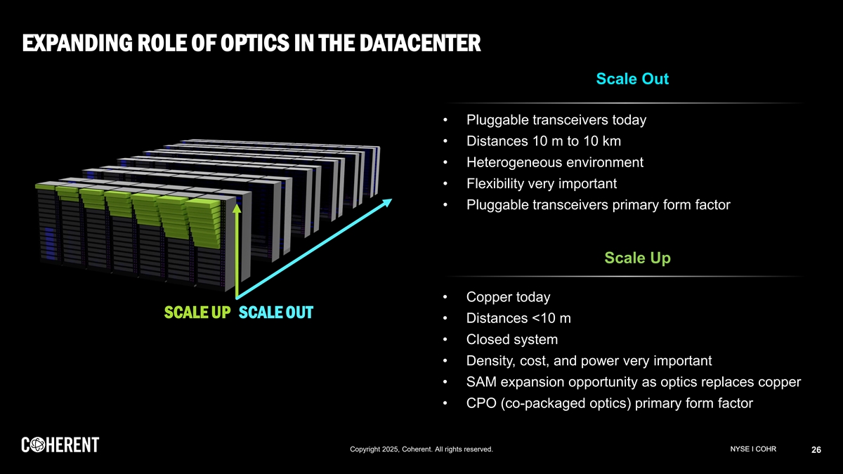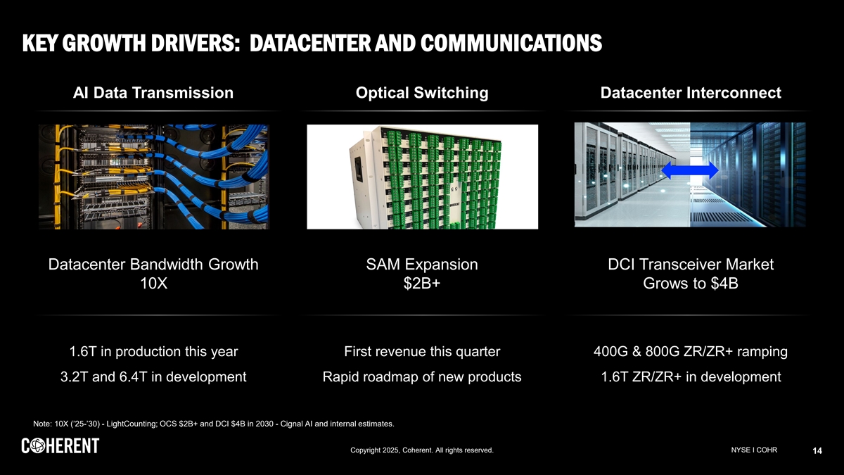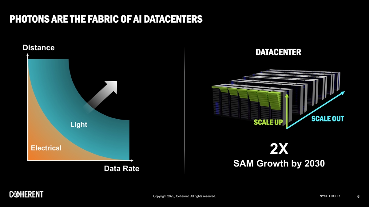 照片是AI DATACENTER的面料距离DATACENTER SALE OUT SALE UP Light Electrical 2X SAM Growth by 2030 Data Rate Copyright 2025,Coherent。版权所有。NYSE I COHR 6