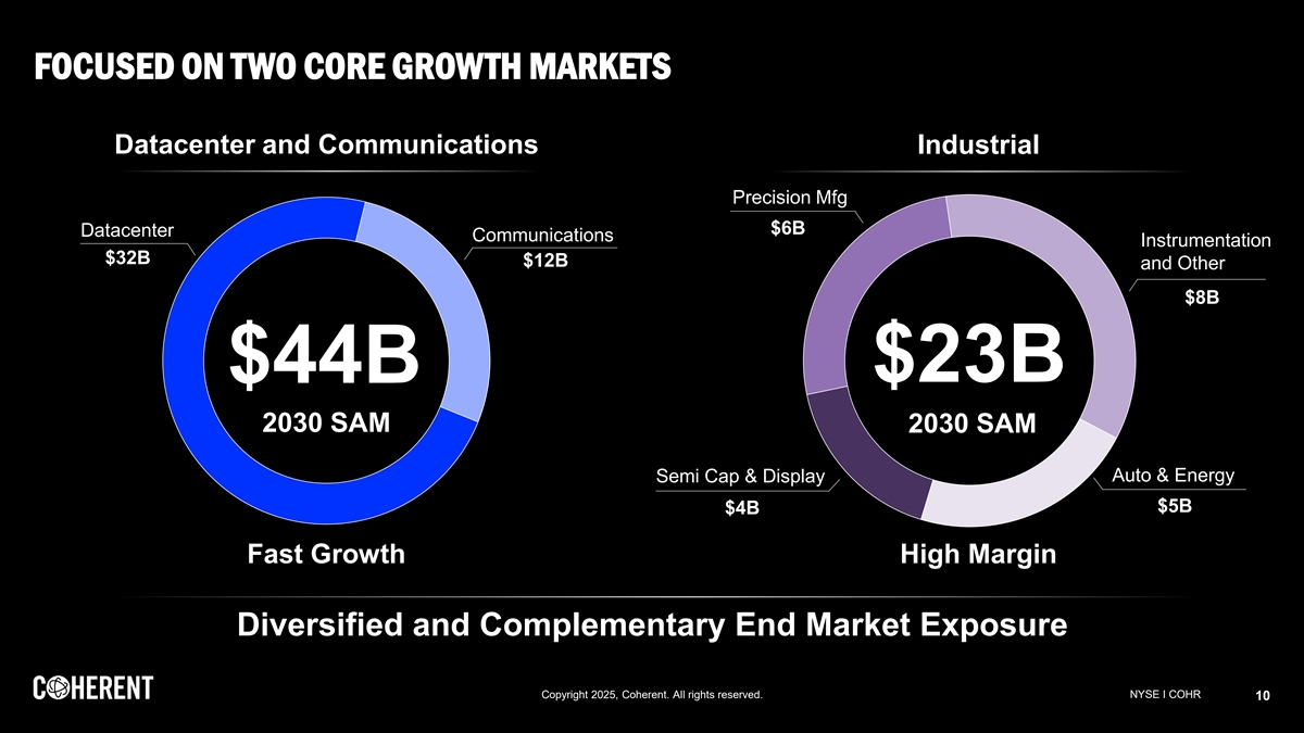 专注于两个核心增长市场Datacenter和Communications Industrial Precision MFG $ 6B Datacenter Communications Instrumentation $ 32B $ 12B和其他$ 8B $ 23B $ 44B 2030 SAM 2030 SAM Auto & Energy Semi Cap & Display $ 5B $ 4B快速增长高利润率多元化互补终端市场曝光版权所有2025,连贯一致。版权所有。NYSE I COHR 10