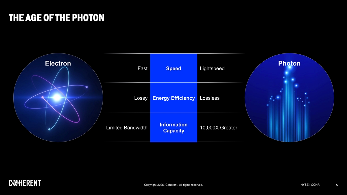 时代的光子电子光子极速光速有损能效无损信息限定带宽10,000X更大容量版权所有2025,连贯一致。版权所有。NYSE I COHR 5