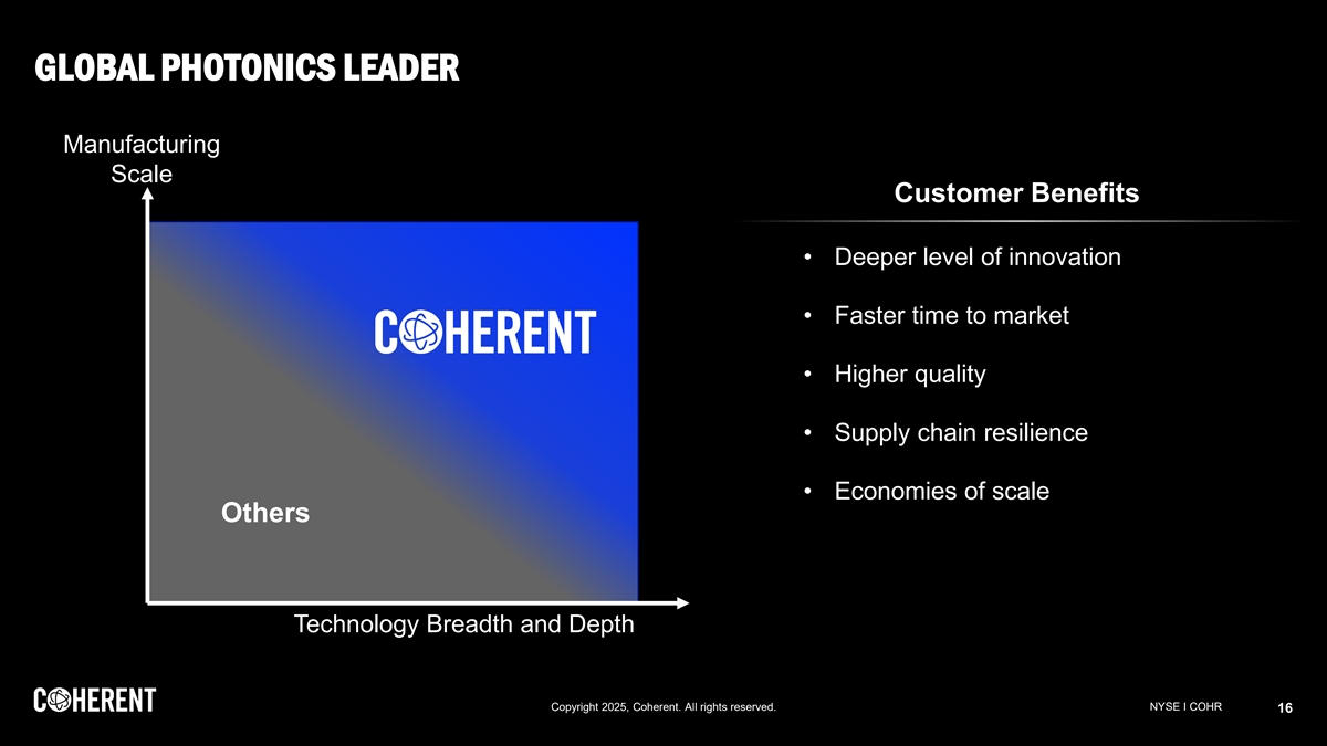 GLOBAL PHOTONICS Leader制造规模客户利益•更深层次的创新•更快的上市时间•更高的质量•供应链弹性•规模经济其他技术广度和深度版权所有2025,连贯一致。版权所有。NYSE I COHR 16