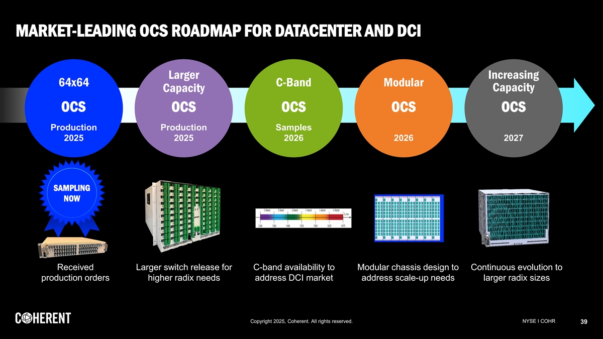 DATACENTER和DCI市场领先的OCS路线图更大幅度增加64x64 C波段模块化产能OCS OCS OCS OCS OCS生产生产样品20252025202620262027采样现在收到更大的开关发布,用于C波段可用性到模块化机箱设计到持续演进到生产订单更高的基数需求解决DCI市场地址放大需要更大的基数尺寸版权所有2025,连贯一致。版权所有。NYSE I COHR 39