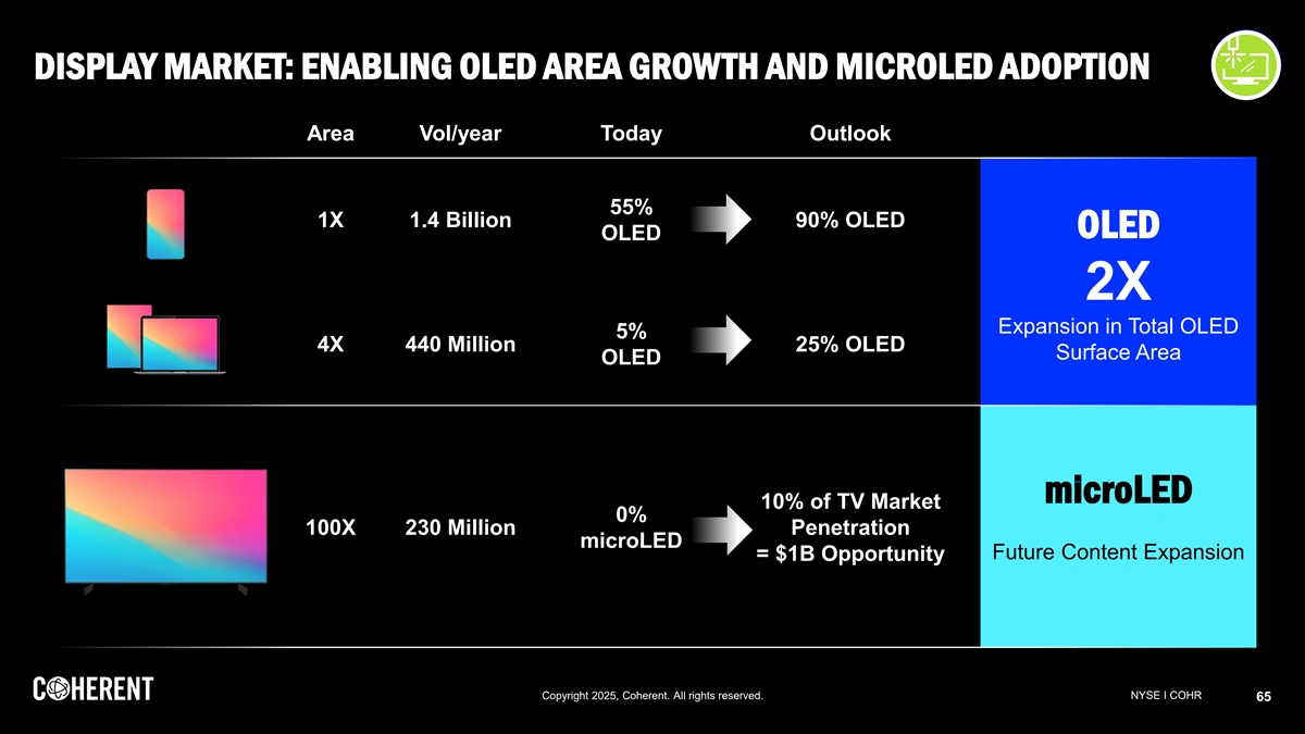 Display Market:Enabling OLED Area Growth and Microled Adoption Area Vol/year Today Outlook 55% 1X 14亿90% OLED OLED OLED 2x Expansion in Total OLED 5% 4X 4.4亿25% OLED Surface Area OLED microLED 10% of TV market 0% 100X 2.3亿penetration microLED future content expansion = $ 1B Opportunity Copyright 2025,coherent。版权所有。NYSE I COHR 65