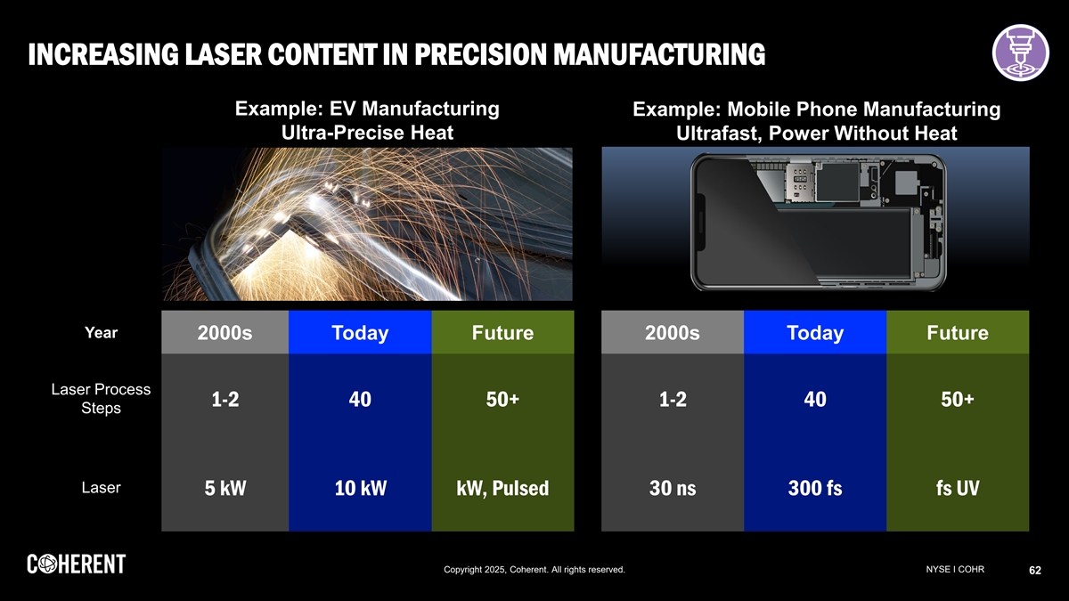 光子是先进制造精度不可或缺的先进制造激光器可实现超过40个制造步骤五种不同类型的激光器所需光机械速度复杂性驱动激光增长版权所有2025,连贯一致。版权所有。NYSE I COHR 7
