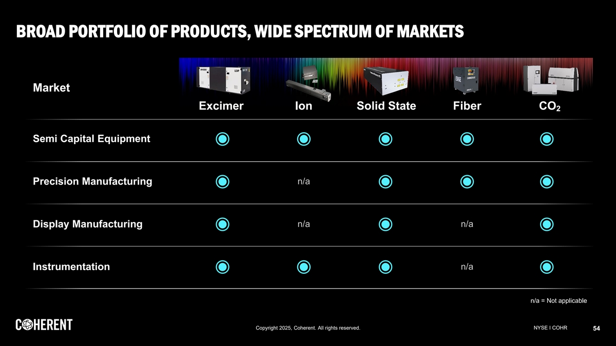 广泛的产品组合,广泛的市场范围准分子离子固态纤维CO 2 Semi Capital Equipment n/a精密制造n/a n/a显示器制造n/a仪器仪表n/a =不适用Copyright 2025,coherent。版权所有。NYSE I COHR 54