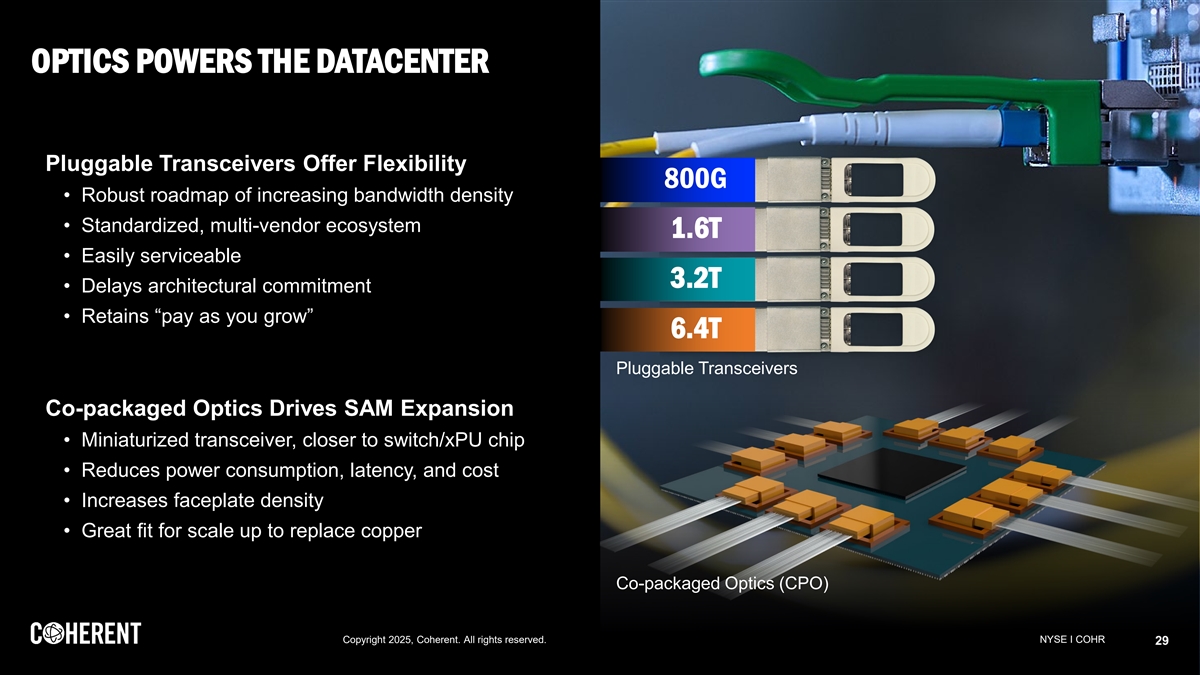 DATACENTER光学接口在十年结束时增长SAM($ B):Pluggables,CPO $ 35 $ 30 CPO $ 25 $ 20 Pluggables $ 15 $ 10 ScaleUp ScaleUT $ 5 $-20232024202520262027202820292030 ScaleUp Pluggables ScaleUp CPO ScaleUp CPO LightCounting and Internal Estimates Copyright 2025,coherent。版权所有。纽约证券交易所I COHR 27