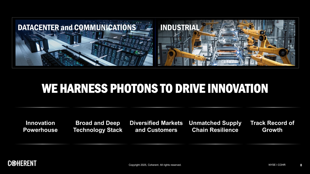 DATACENTER和Communications Industrial WE HARNESS PhotONS to Drive Innovation Innovation Broad and Deep Diversified Markets Unmatched Supply Track Record of Powerhouse Technology Stack and Customers Chain Resilience Growth Copyright 2025,Coherent。版权所有。NYSE I COHR 8