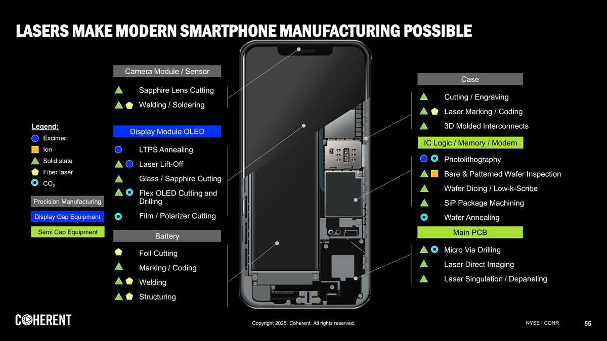 激光让现代智能手机制造成为可能相机模块/传感器外壳蓝宝石镜头切割切割/雕刻焊接/焊接激光打标/编码图例:3D模压互连显示模块OLED准分子IC逻辑/存储器/调制解调器离子LTPS退火光刻固态激光升空光纤激光器裸照和图案化晶圆检测玻璃/蓝宝石切割CO 2晶圆划片/low-k-Scribe Flex OLED切割和精密制造钻孔SiP封装加工薄膜/偏光片切割显示帽设备晶圆退火半帽设备主PCB电池Micro via钻孔箔切割激光直接成像标记/编码激光单挑/脱单焊接结构Copyright 2025,coherent。版权所有。NYSE I COHR 55