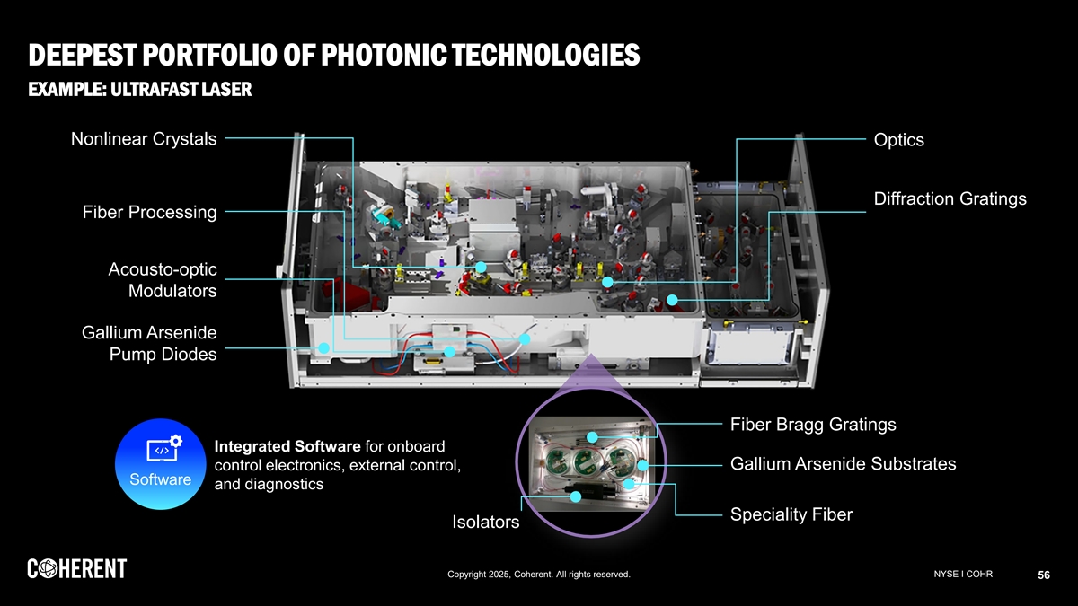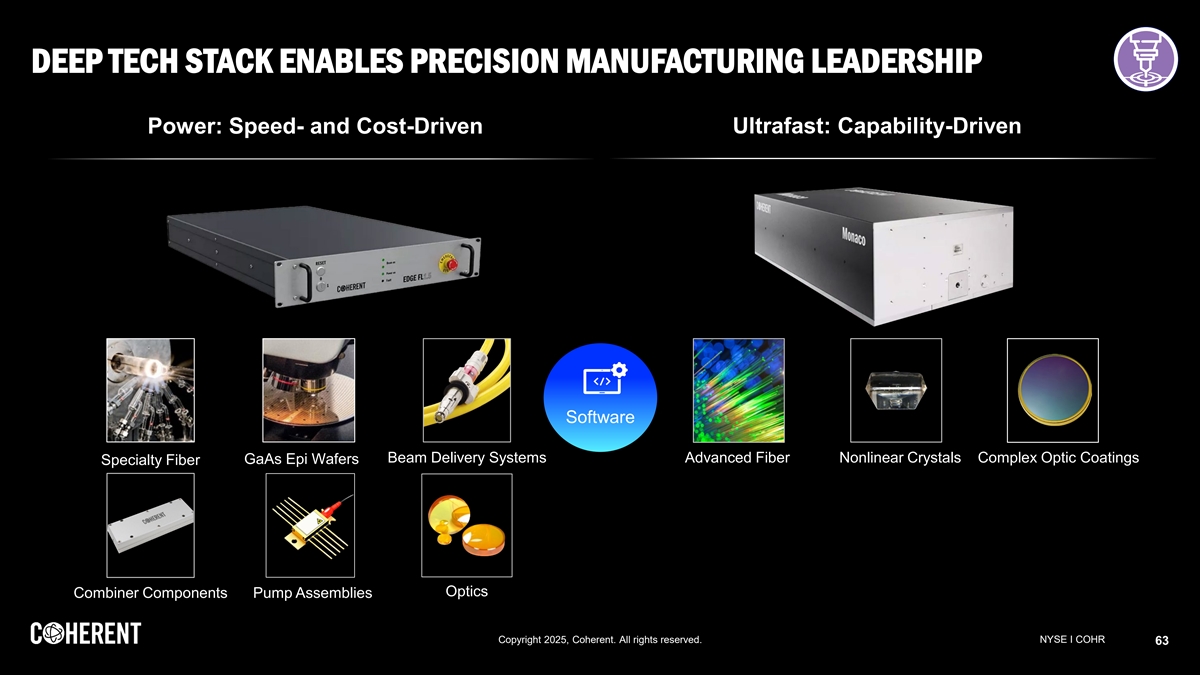 Deep TECH STACK启用精密制造领导力:速度和成本驱动的超快:能力驱动的软件波束传输系统先进光纤非线性晶体复杂光学涂层GaAs Epi Wafers特种光纤组合器组件泵组件版权所有2025,连贯一致。版权所有。NYSE I COHR 63