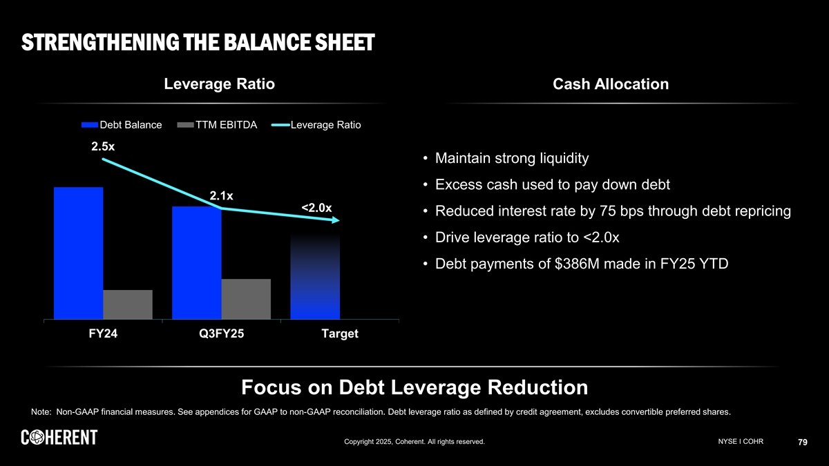 加强资产负债表杠杆率现金分配债务余额TTM EBITDA杠杆率2.5x •保持较强流动性•用于偿还债务的超额现金2.1x < 2.0x •通过债务重定价将利率降低75bps •推动杠杆率降至< 2.0x • 25财年年初至今的3.86亿美元债务支付FY24 Q3FY25目标关注债务杠杆降低注:非公认会计准则财务指标。有关GAAP与非GAAP对账,请参见附录。信用协议定义的债务杠杆率,不包括可转换优先股。版权所有2025,连贯一致。版权所有。NYSE I COHR 79