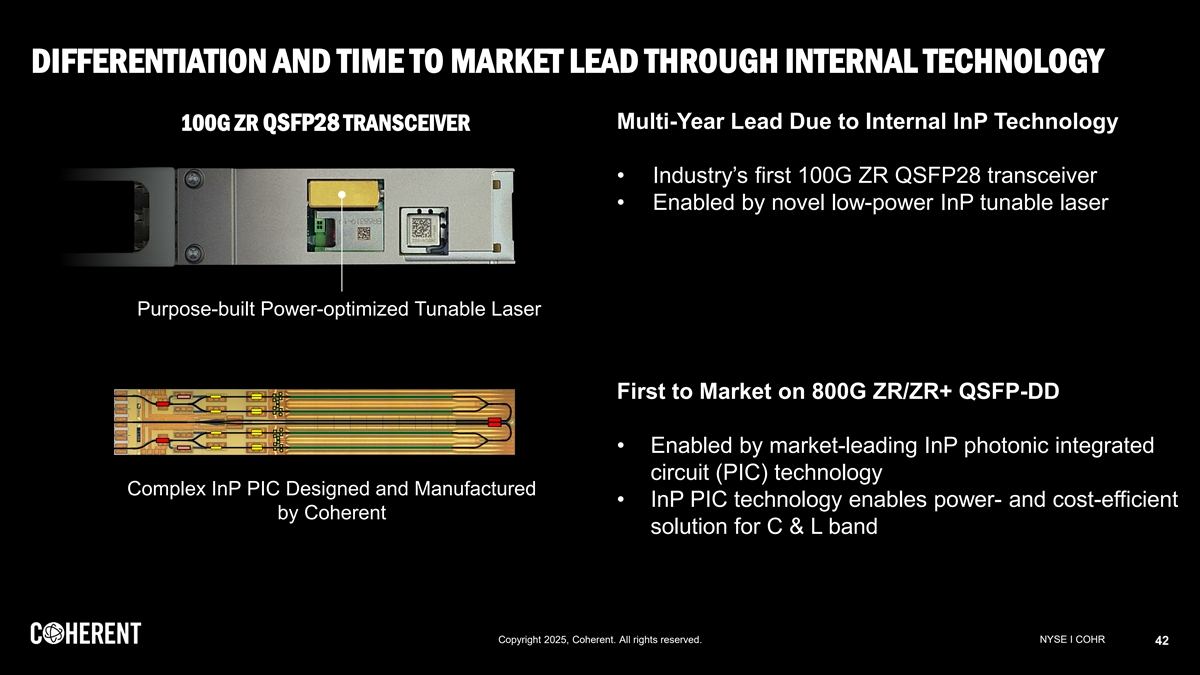 数据中心互连(DCI)收发器显着增长•功率限制迫使AI工作负载分散在多个数据中心•推动数据中心之间需要更多、更高速的DCI光互连• 100G、400G、800G ZR/ZR +收发器对DCI至关重要5美元DCI收发器SAM($ B)4美元3美元2美元4B美元1美元DCI收发器SAM到2030年0美元20232024202520262027202820292030资料来源:信诺AI和内部估计版权所有2025,连贯一致。版权所有。NYSE I COHR 41