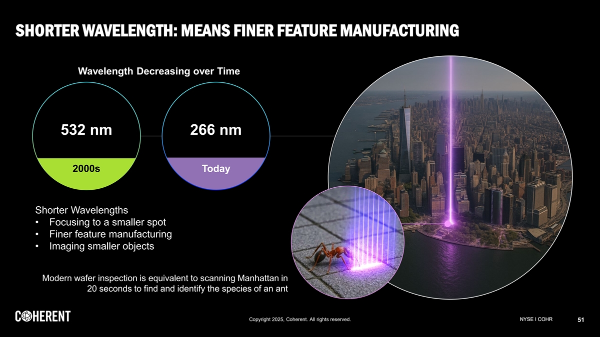 更短的波长率:意味着更精细的特征制造波长随时间减少532 nm 266 nm 2000s如今更短的波长•聚焦到更小的点•更精细的特征制造•对更小的物体进行成像现代晶圆检测相当于在20秒内扫描曼哈顿以找到并识别蚂蚁版权2025的物种,连贯一致。版权所有。NY NYS SE E I I CO COHR HR 51