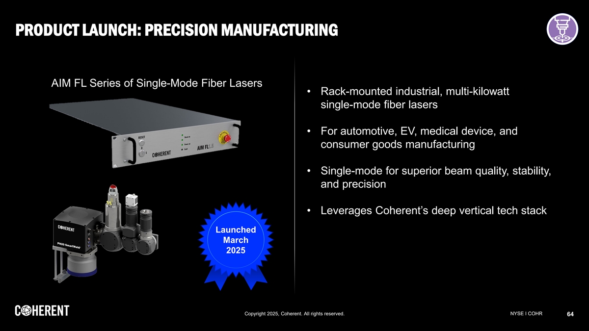 产品发布:Precision Manufacturing AIM FL系列单模光纤激光器•机架式工业、多千瓦单模光纤激光器•用于汽车、电动汽车、医疗器械和消费品制造•单模实现卓越的光束质量、稳定性和精确度•利用Coherent于2025年3月推出的深度垂直技术堆栈,版权所有2025,Coherent。版权所有。NYSE I COHR 64