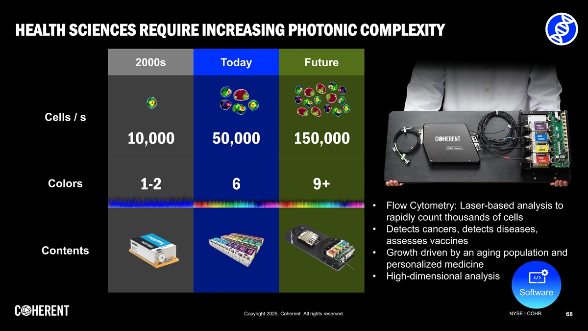 健康科学需要日益增加的光照复杂性2000s today future cells/s 10,00050,000150,000 colors 1-2 69 + •流式细胞术:基于激光的分析,快速计数数千个细胞•检测癌症、检测疾病、评估疫苗含量•人口老龄化和个性化医疗推动的增长•高维分析软件版权所有2025,连贯一致。版权所有。NYSE I COHR 68