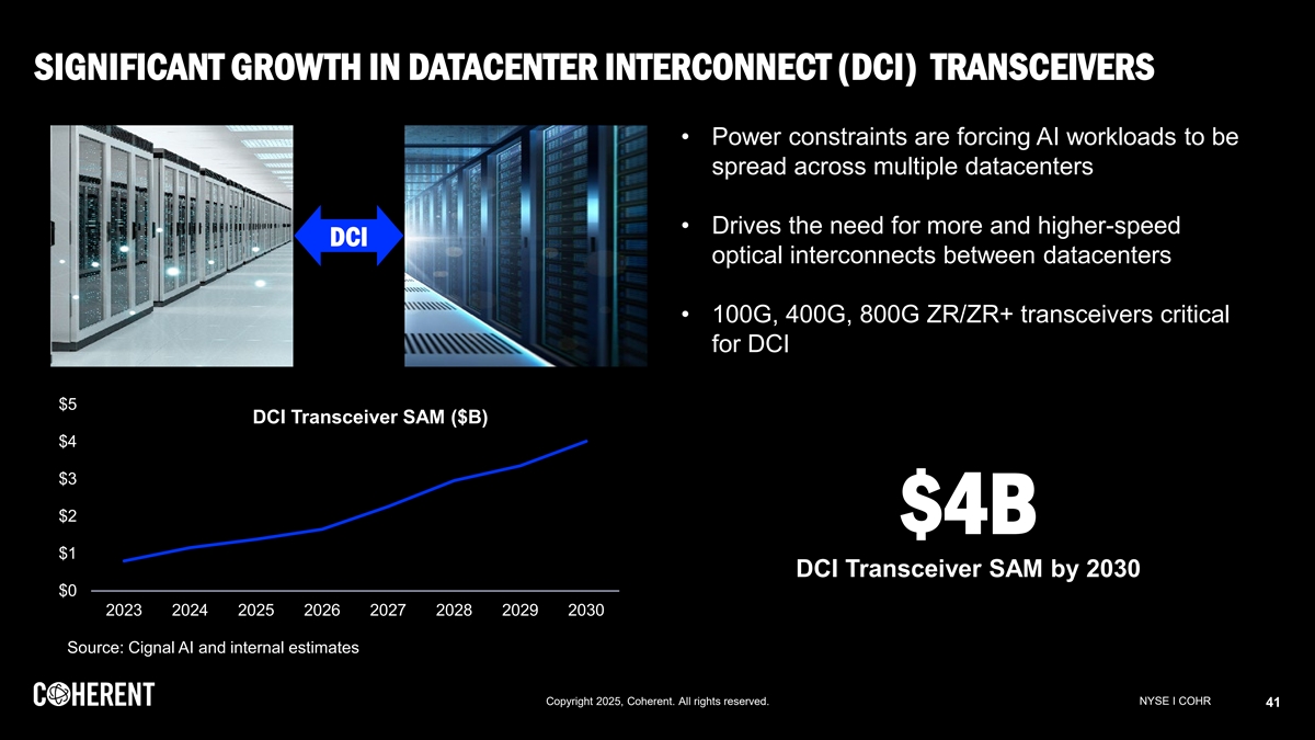 POWERing DATACENTER and Communications Network Datacenter and Communications Satellite Datacenter Datacenter Communications $ 32B $ 12B Submarine Long Haul Transmission Metro $ 44B 2030 SAM Backbone Transport Copyright 2025,Coherent。版权所有。NYSE I COHR 40