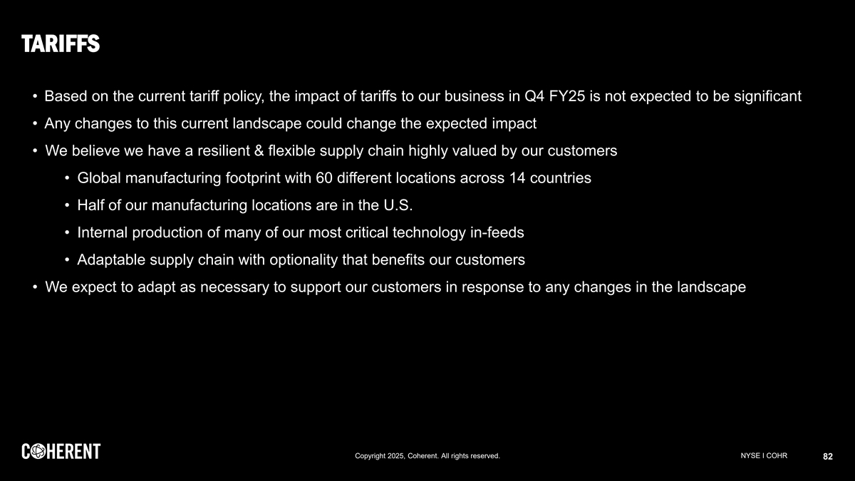 TARIFFS •基于现行关税政策,预计25财年第四季度关税对我们业务的影响不会很大•当前这一格局的任何变化都可能改变预期的影响•我们相信,我们拥有一条受到客户高度重视的有弹性和灵活的供应链•全球制造足迹遍布14个国家的60个不同地点•我们一半的制造地点在美国•我们许多最关键的技术In-Feed的内部生产•具有可选择性的适应性供应链使我们的客户受益•我们希望根据需要进行调整,以支持我们的客户,以应对景观版权所有2025的任何变化,连贯一致。版权所有。NYSE I COHR 82