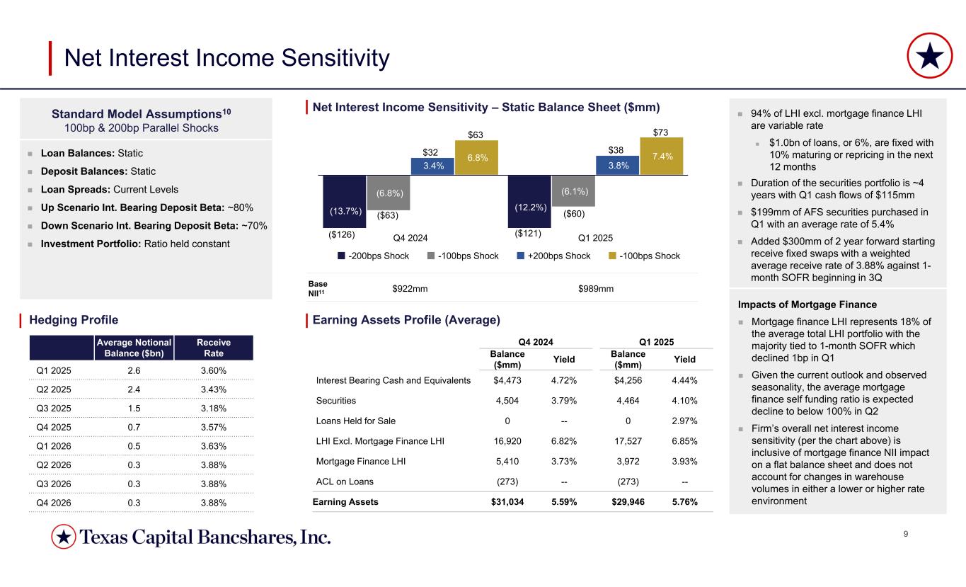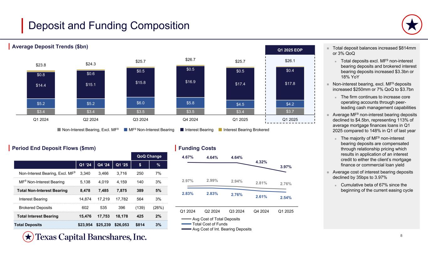 8 $ 3.4 $ 3.4 $ 3.5 $ 3.5 $ 3.4 $ 3.7 $ 5.2 $ 5.2 $ 6.0 $ 5.8 $ 4.5 $ 4.2 $ 14.4 $ 15.1 $ 15.8 $ 16.9 $ 17.4 $ 17.8 $ 0.8 $ 0.6 $ 0.5 $ 0.5 $ 0.5 $ 0.4 $ 23.8 $ 24.3 $ 25.7 $ 26.7 $ 25.7 $ 26.1 Q1 2024 Q2 2024 Q3 2024 Q4 2024 Q1 2025 Q1 2025 2.97% 2.99% 2.94% 2.81% 2.76% 2.83% 2.76% 2.61% 2.54% 4.67% 4.64% 4.64% 4.32% 3.97% Q1 2024 Q2 2024 Q3 2024 Q4 2024 Q1 2025 Q1 2025 EOP存款和资金构成总存款余额增加814mm或3%环比总存款不包括MF9无息存款和经纪有息存款同比增加33亿美元或18%不含息MF9存款环比增加250mm或7%至37亿美元该公司继续通过同行领先的现金管理能力增加核心运营账户平均MF9无息存款降至45亿美元,占2025年第一季度平均抵押贷款融资贷款的113%,而去年第一季度为148%。大多数MF9无息存款通过关系定价得到补偿,这导致对客户的抵押贷款融资或商业贷款收益率应用利息信用。自当前宽松周期开始以来,有息存款的平均成本下降了35个基点至3.97%,累计贝塔系数为67%。平均存款趋势(十亿美元)期末存款流量(毫米)资金成本环比变动% $ Q1‘25Q4’24Q1 ' 247% 2503,7163,4663,340非有息,不含税。MF9 3% 1404,1594,0195,138 MF9非计息5% 3897,8757,4858,478非计息总额3% 56417,78217,21914,874计息(26%)(139)396535602经纪存款2% 42518,17817,75315,476总计息3% $ 814 $ 26,053 $ 25,239 $ 23,954总存款总资金成本Avg Int成本。轴承存款平均总存款成本非利息轴承,不包括。MF9 MF9无息计息经纪