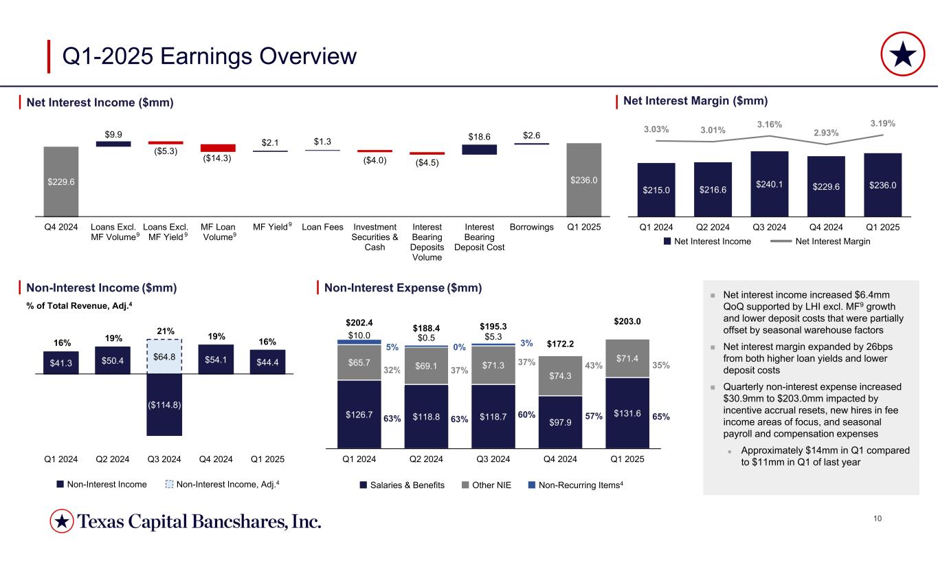 10 $ 126.7 $ 118.8 $ 118.7 $ 97.9 $ 131.6 $ 65.7 $ 69.1 $ 71.3 $ 74.3 $ 71.4 $ 10.0 $ 0.5 $ 5.3 $ 202.4 $ 188.4 $ 195.3 $ 172.2 $ 203.0 Q1 2024 Q2 2024 Q3 2024 Q4 2024 Q1 2025 $ 41.3 $ 50.4($ 114.8)$ 54.1 $ 44.4 $ 64.8 Q1 2024 Q2 2024 Q3 2024 Q4 2024 Q1 2025 $ 215.0 $ 216.6 $ 240.1 $ 229.6 $ 236.0 3.03% 3.01% 3.16% 2.93% 3.19% Q1 2024 Q2 2024 Q3 2024 Q4 2024 Q1 2025 $ 229.6 $ 9.9($ 5.3)($ 14.3)$ 2.1 $ 1.3($ 4.0)($ 4.5)$ 18.6 $ 2.6 $ 236.0 Q4 2024贷款不含税。MF批量贷款不包括。MF收益率MF贷款数量MF收益率贷款费用投资证券&现金计息存款数量计息存款成本借款2025年第一季度32% 63% 63% 60% 57% 2025年第一季度收益概览净息差($ mm)净利息收入($ mm)非利息收入($ mm)非利息费用($ mm)65%净利息收入增加$ 6.4mm环比支持LHI不包括MF9增长和存款成本下降部分被季节性仓库因素所抵消净息差因贷款收益率上升和存款成本下降而扩大26个基点季度非利息支出增加30.9mm至203.0mm,受激励应计重置、收费收入重点领域的新雇员以及季节性工资和薪酬支出影响,第一季度约为14mm,而去年第一季度为11mm,占总收入的999935% 43%,Adj.4 16% 19% 21% 19% 16% 5% 37% 0% 3% 37%净利息收入净息差工资&福利其他NIE非经常性项目4Non-Interest Income Non-Interest Income,Adj.4