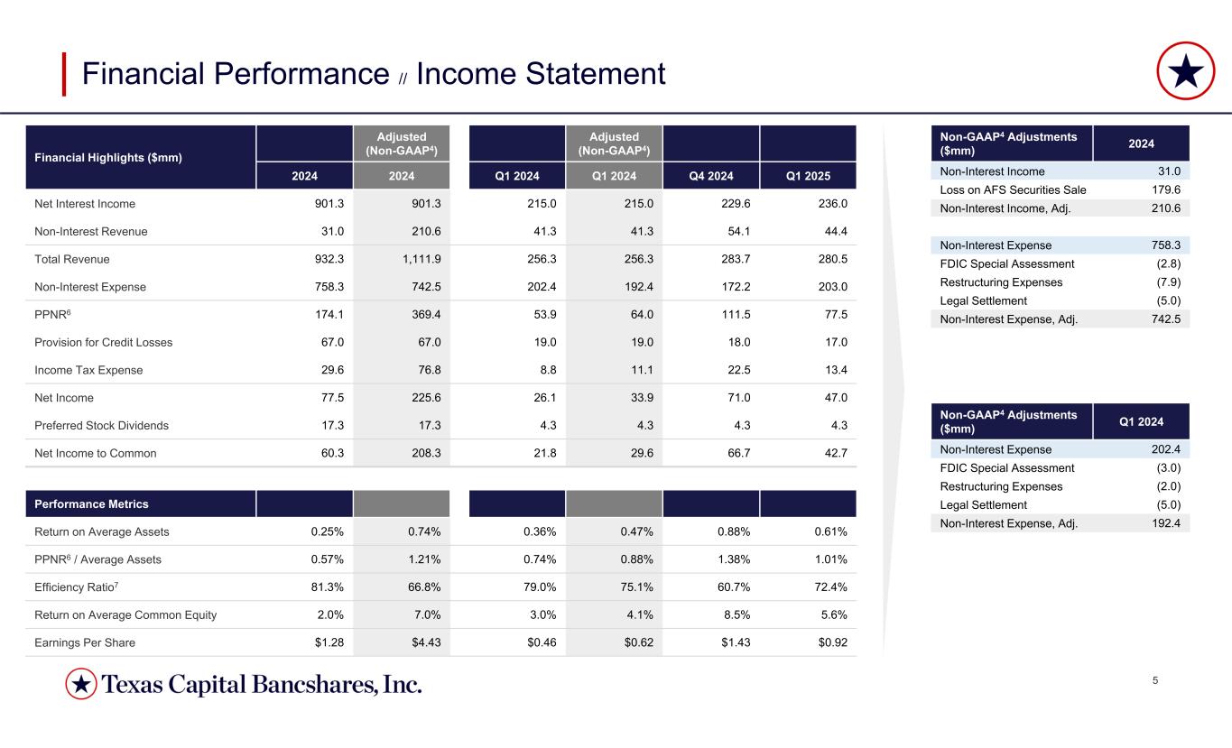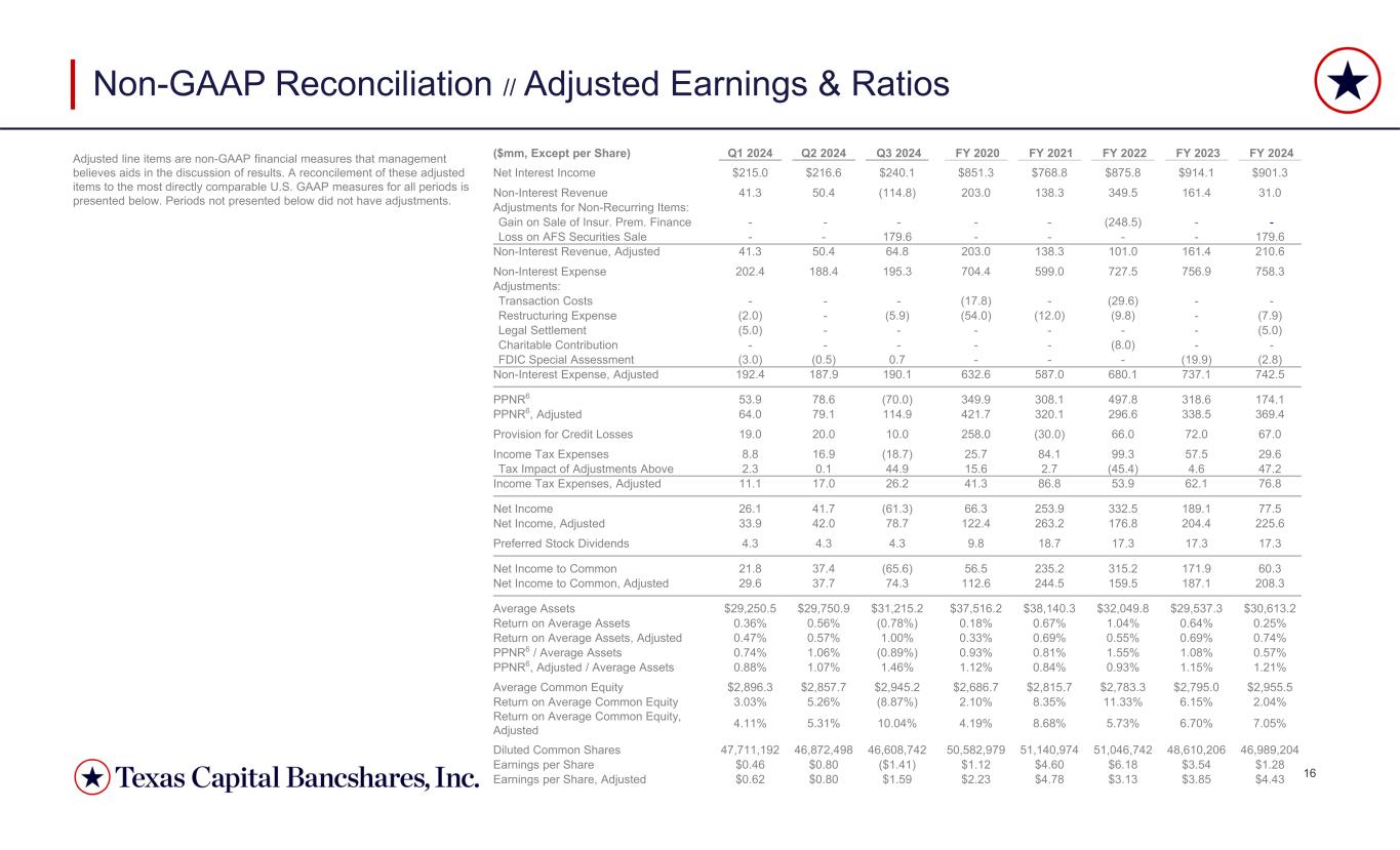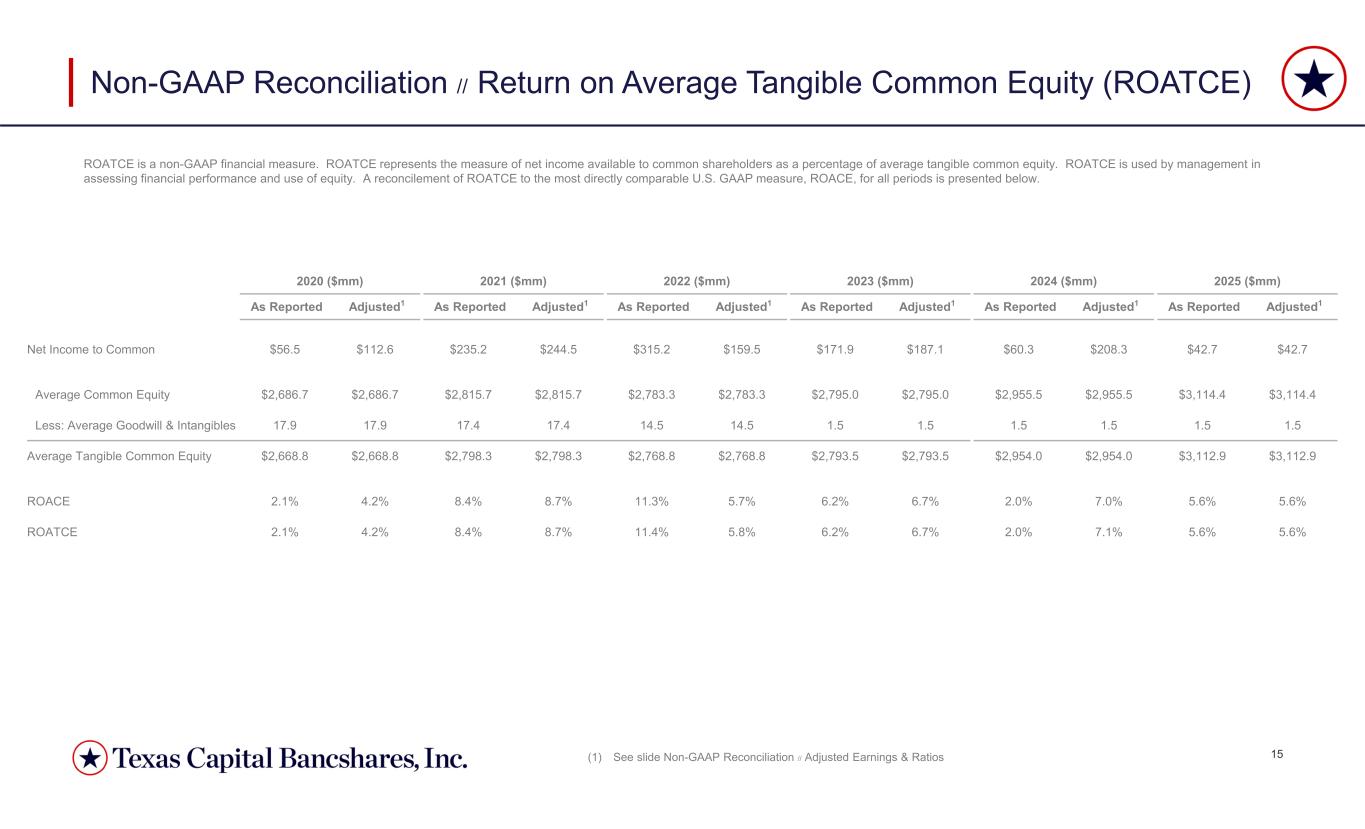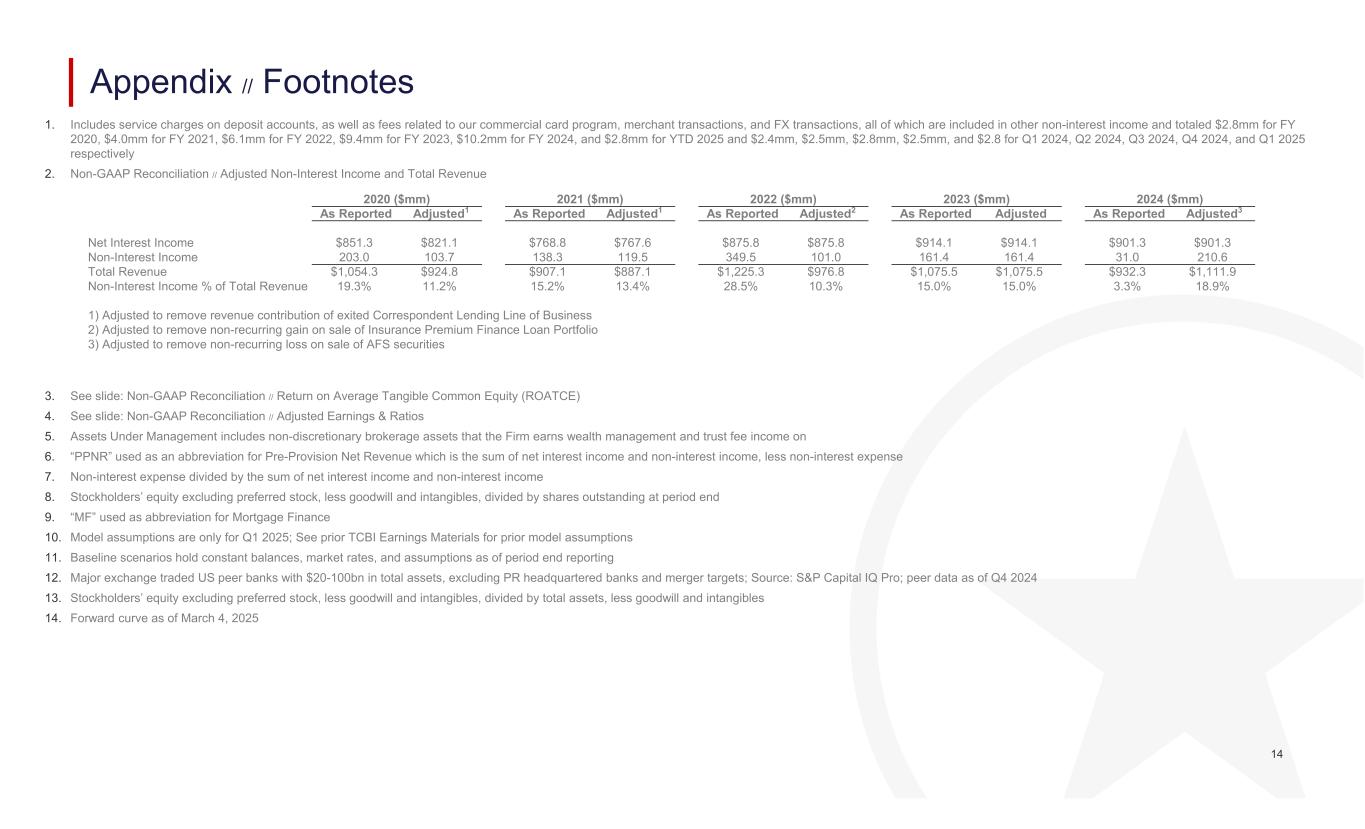 14 1.包括存款账户的服务费,以及与我们的商业卡计划、商户交易和外汇交易相关的费用,所有这些都包括在其他非利息收入中,2020财年总计2.8mm,2021财年4.0mm,2022财年6.1mm,2023财年9.4mm,2024财年10.2mm,2025年年初至今2.8mm,2024年第一季度、2024年第二季度、2024年第三季度、2024年第四季度和2025年第一季度分别为2.4mm、2.5mm、2.8mm、2.5mm和2.8美元2。非美国通用会计准则调节//调整后的非利息收入和总收入3。见幻灯片:非美国通用会计准则调节//平均有形普通股本回报率(ROATCE)4。见幻灯片:非GAAP调节//调整后收益和比率5。管理资产包括公司在6日赚取财富管理和信托手续费收入的非全权委托券商资产。“PPNR”作为Pre-Provision Net Revenue的简称,是净利息收入和非利息收入之和,减去非利息费用7。非利息支出除以净利息收入和非利息收入之和8。不包括优先股的股东权益,减去商誉和无形资产,除以期末流通股9。“MF”用作Mortgage Finance 10的简称。模型假设仅适用于2025年第一季度;有关先前模型假设11.请参阅先前的TCBI收益材料。基准情景保持不变的余额、市场利率和截至期末报告12的假设。主要交易所交易的美国同行银行的总资产为200-1000亿美元,不包括总部位于PR的银行和合并目标;资料来源:标普 Capital IQ Pro;截至2024年第四季度的同行数据13。除优先股以外的股东权益,减去商誉和无形资产,除以总资产,减去商誉和无形资产14。截至3月4日的远期曲线,20252024($ mm)2023($ mm)2022($ mm)2021($ mm)2020($ mm)Adjusted3as reported adjusted as reported adjusted2as reported adjusted1as reported adjusted1as reported adjusted1as reported $ 901.3 $ 901.3 $ 914.1 $ 914.1 $ 875.8 $ 875.8 $ 767.6 $ 768.8 $ 821.1 $ 851.3净利息收入210.63 1.01 61.4161.4 101.03 49.51 19.5 138.3 103.7 203.0非利息收入$ 1,111.9 $ 932.3 $ 1,075.5 $ 1,075.5 $ 976.8 $ 1,225.3 $ 887.1 $ 907.1 $ 924.8//脚注