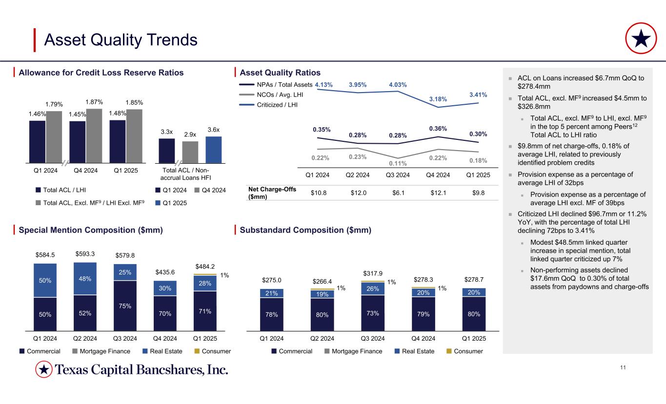 110.35% 0.28% 0.28% 0.36% 0.30% 0.22% 0.23% 0.11% 0.22% 0.18% 4.13% 3.95% 4.03% 3.18% 3.41% Q1 2024 Q2 2024 Q3 2024 Q4 2024 Q1 202578 % 80% 73% 79% 80% 21% 19% 26% 20% 20% 1% 1% 1% $ 275.0 $ 266.4 $ 317.9 $ 278.3 $ 278.7 Q1 2024 Q2 2024 Q3 2024 Q4 202550% 52% 75% 70% 71% 50% 48% 25% 30% 28% 1% $ 584.5 $ 593.3 $ 579.8 $ 435.6 $ 484.2 Q1 2024 Q2 2024 Q3 2024 Q4 2024 Q1 2025 3.3x 2.9x 3.6x 1.46% 1.45% 1.48% 1.79% 1.87% 1.85% Q1 2024 Q4 2024 Q1 2025资产质量趋势津贴信用损失准备金比率资产质量比率特别提及构成($ mm)次级构成($ mm)$ 9.8 $ 12.1 $ 6.1 $ 12.0 $ 10.8净冲销($ mm)ACL/非应计贷款总额HFI ACL贷款总额环比增加$ 6.7mm至$ 278.4mm总ACL,不包括。MF9增加4.5mm美元至326.8mm总ACL,不含税。MF9至LHI,不含税。MF9在同行中排名前5% 12总ACL与LHI比率$ 9.8mm净冲销,平均LHI的0.18%,与先前确定的问题信贷有关拨备费用占平均LHI的百分比为32bps拨备费用占平均LHI的百分比不包括。MF为39bps被批评的LHI同比下降96.7mm或11.2%,占总LHI的百分比下降72bps至3.41%适度的48.5mm关联季度增加特别关注,总关联季度被批评上升7%不良资产环比下降17.6mm至总资产的0.30%商业抵押贷款融资房地产消费者商业抵押贷款融资房地产消费者总ACL/LHI总ACL,不包括。MF9/LHI不含税。MF9 2024年第一季度2024年第四季度2025年第一季度不良资产/总资产NCO/平均LHI批评/LHI