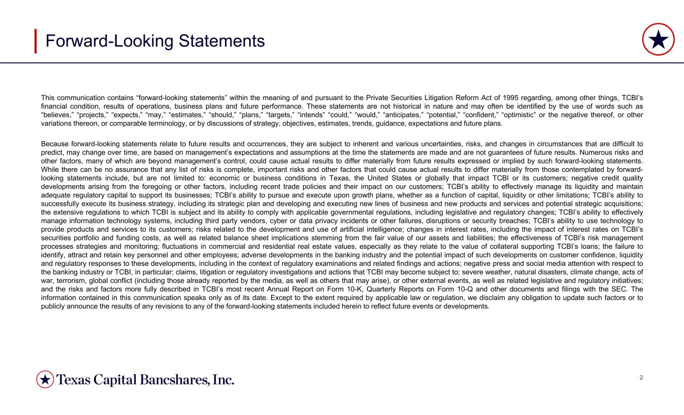 2前瞻性陈述本通讯包含1995年《私人证券诉讼改革法案》含义内并根据该法案做出的“前瞻性陈述”,这些陈述涉及(其中包括)TCBI的财务状况、经营业绩、业务计划和未来业绩。这些陈述不是历史性的,通常可以通过使用诸如“相信”、“项目”、“预期”、“可能”、“估计”、“应该”、“计划”、“目标”、“打算”、“可能”、“将”、“预期”、“潜在”、“有信心”、“乐观”或其否定,或其他变体,或类似术语,或通过对战略、目标、估计、趋势、指导、预期和未来计划的讨论来识别。由于前瞻性陈述与未来的结果和事件有关,它们受到固有的和各种不确定性、风险以及难以预测的情况变化的影响,可能会随着时间而变化,是基于管理层在做出陈述时的预期和假设,而不是对未来结果的保证。众多风险和其他因素,其中许多超出了管理层的控制范围,可能导致实际结果与此类前瞻性陈述所表达或暗示的未来结果存在重大差异。虽然无法保证任何风险清单是完整的,但可能导致实际结果与前瞻性陈述所设想的结果存在重大差异的重要风险和其他因素包括但不限于:美国德克萨斯州或全球范围内影响TCBI或其客户的经济或商业状况;由上述或其他因素引起的负面信用质量发展,包括最近的贸易政策及其对我们客户的影响;TCBI有效管理其流动性和维持充足监管资本以支持其业务的能力;TCBI追求和执行增长计划的能力,无论是作为资本、流动性还是其他限制的函数;TCBI成功执行其业务战略的能力,包括其战略计划以及开发和执行新业务线、新产品和服务以及潜在的战略收购;TCBI受制于广泛的法规及其遵守适用政府法规的能力,包括立法和法规方面的变化;TCBI有效管理信息技术系统的能力,包括第三方供应商、网络或数据隐私事件或其他故障、中断或安全漏洞;TCBI使用技术向其客户提供产品和服务的能力;与人工智能的开发和使用相关的风险;利率的变化,包括利率对TCBI的证券组合和融资成本的影响,以及我们的资产和负债的公允价值产生的相关资产负债表影响;TCBI风险管理流程战略和监测的有效性;商业和住宅房地产价值的波动,尤其是与支持TCBI贷款的抵押品价值相关的波动;未能识别、吸引和留住关键人员和其他员工;银行业的不利发展以及此类发展对客户信心、流动性和监管机构应对这些发展的潜在影响,包括在监管审查和相关调查结果及行动的背景下;尤其是与银行业或TCBI有关的负面新闻和社交媒体关注;TCBI可能会受到的索赔、诉讼或监管调查和行动;恶劣天气、自然灾害、气候变化、战争行为、恐怖主义、全球冲突(包括媒体已经报道的事件,以及可能出现的其他事件),或其他外部事件,以及相关的立法和监管举措;以及在TCBI最近的10-K表格年度报告中更全面描述的风险和因素,表格10-Q和其他文件的季度报告以及向SEC提交的文件。本通讯中包含的信息仅代表截至日期的信息。除适用法律或法规要求的范围外,我们不承担更新此类因素或公开宣布对此处包含的任何前瞻性陈述的任何修订结果以反映未来事件或发展的任何义务。