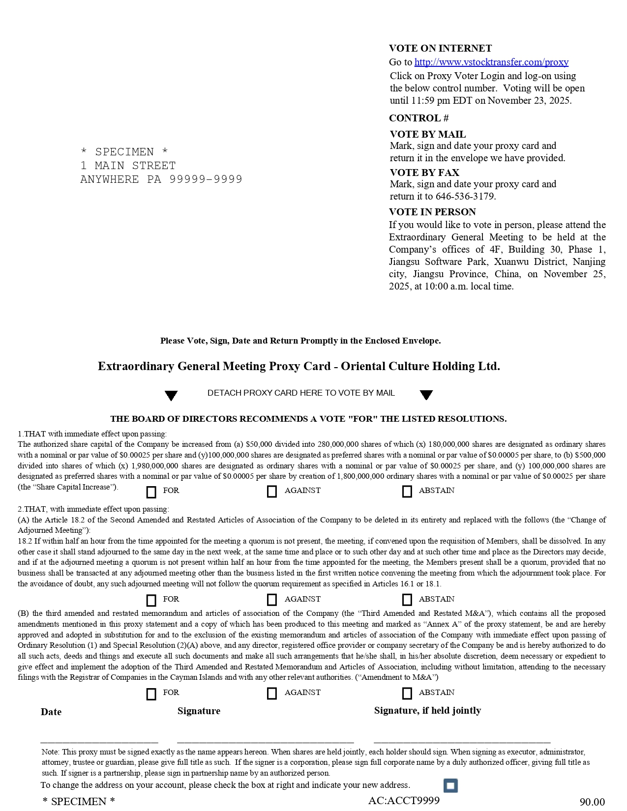互联网投票请访问http://www.vstocktransfer.com/proxy点击代理选民登录,使用以下控制号码登录。投票将开放至美国东部时间2025年11月23日晚上11:59。控制#通过邮件标记进行投票,在您的代理卡上签名并注明日期,并将其放入我们提供的信封中退回。用传真标记进行投票,在您的代理卡上签名并注明日期,然后返回646-536-3179。亲自投票如欲亲自投票,请出席将于中国江苏省南京市玄武区江苏软件园一期30号楼4楼公司办公室于当地时间2025年11月25日上午10时举行的临时股东大会。*规格*1 Main Street Anywhere PA 99999-9999请在随附的信封内及时投票、签名、注明日期并返回。临时股东大会代理卡-东方文化控股有限公司。DETACH代理卡在此以邮寄方式投票董事会建议对上市决议投“赞成”票。1 .通过后即时生效:公司法定股本由(a)50,000元增加至280,000,000股股份,其中(x)180,000,000股股份指定为面值或面值为0元的普通股。每股00025及(y)100,000,000股指定为优先股,面值或面值为0元。00005/股,至(b)500,000美元分成股份,其中(x)1,980,000,000股股份指定为面值或面值为0美元的普通股。00025/股,及(y)100,000,000股指定为优先股,面值或面值为0美元。通过创建1,800,000,000股面值或面值为0美元的普通股,每股00005。00025/股(“转增股本”)。反对弃权2。即,通过后立即生效:(a)第18条。经修订及重述的《公司章程》第2条全文删除,改为(“续会变更”):18。2自指定召开会议的时间起半小时内,未达到法定人数的,经委员要求召开的会议解散。在任何其他情况下,委员会须延期至下一星期的同日、同一时间及地点或其他日期及董事决定的其他时间及地点,而如在续会上,自委任为会议的时间起计半小时内未有法定人数出席,则出席的成员即为法定人数,但任何续会上不得处理任何事务,但召开续会的会议的首份书面通知所列业务除外。为免生疑问,任何此类延期会议将不遵循第16条规定的法定人数要求。1或18。1 .反对弃权(b)载有本代表声明中提及的所有建议修订且其副本已向本次会议出示并标记为代表声明“附件A”的公司第三次经修订及重述的组织章程大纲及章程细则(“第三次经修订及重述的并购”),现予批准及采纳,以取代及排除公司现有的组织章程大纲及章程细则,于通过上述普通决议(1)及特别决议(2)(a)后即时生效,及公司的任何董事、注册办事处提供者或公司秘书获授权并在此获授权作出所有该等作为、契据及事情,签立所有该等文件,并作出所有该等安排,而他/她须以其绝对酌情权认为有必要或合宜实施及落实采纳第三次经修订及重述的组织章程大纲及章程细则,包括但不限于出席向开曼群岛公司注册处处长及任何其他有关当局提交的必要文件。(“并购修正案”)反对签字弃权签字,如共同持有日期注:本委托书的签字必须与本协议所列名称完全一致。共同持股时,各持有人应签字。在作为被执行人、管理人、代理人、受托人或监护人签字时,请提供完整的所有权。如签字人是法团,请由正式授权人员签署公司全称,并给予全称。如签字人为合伙企业,请经授权人签入合伙企业名称。要更改您账户上的地址,请勾选右侧方框,并注明您的新地址。*规格*AC:ACCT9999 90.00