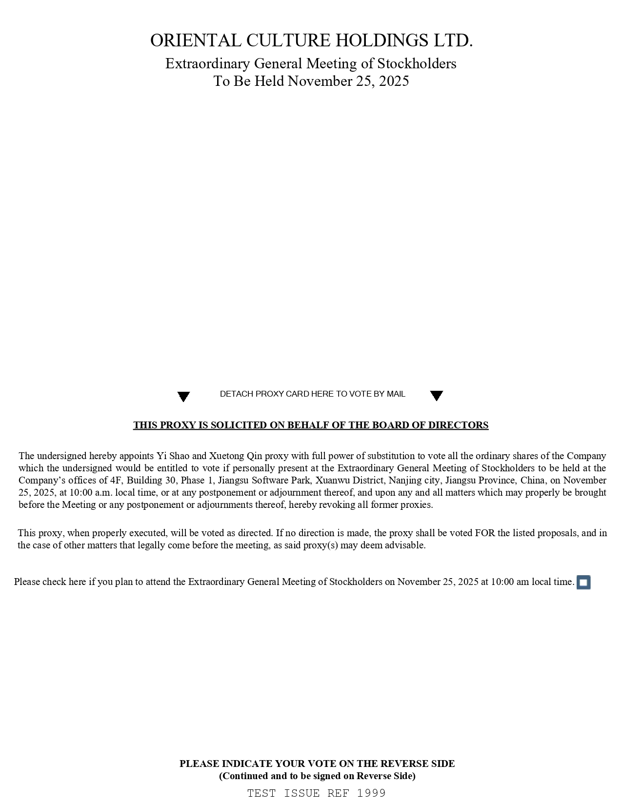 东方文化控股有限公司。将于2025年11月25日召开的临时股东大会DETACH代理卡在此以邮寄方式进行投票本代理卡是代表董事会征集的,以下签署人特此委任Yi Shao及秦学通具全权替代权,以投票表决下列签署人如亲自出席将在中国江苏省南京市玄武区江苏软件园一期30号楼4 F公司办公室召开的临时股东大会将有权投票的公司所有普通股,在当地时间2025年11月25日上午10:00,或在会议的任何延期或休会时,并就可适当提交会议或其任何延期或休会的任何和所有事项,特此撤销所有前代理人。此代理,如果正确执行,将按指示进行投票。如未作出指示,该代理人应对所列提案投赞成票,如有其他合法提交会议的事项,该代理人可能认为可取。如果您计划参加当地时间2025年11月25日上午10:00召开的临时股东大会,请在这里查询。请在反面注明您的投票(续并在反面签名)Test Issue REF 1999