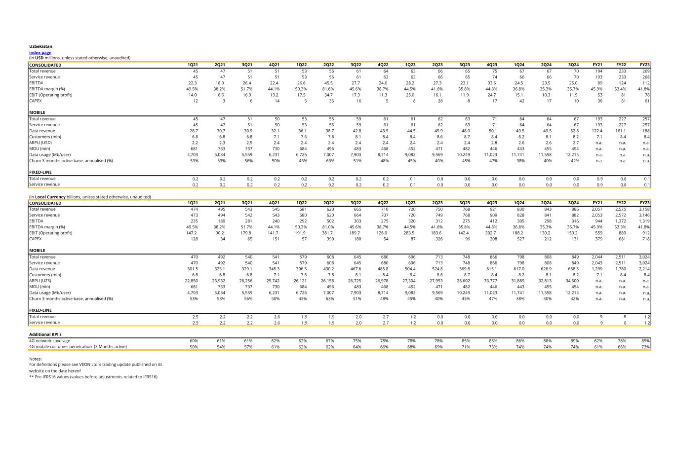 乌兹别克斯坦索引页面(单位:百万美元,除非另有说明,未经审计)合并1Q21 2Q21 3Q21 4Q21 1Q22 2Q22 3Q22 4Q22 1Q23 2Q23 3Q23 4Q23 1Q24 2Q24 3Q24 FY21 FY22 FY23总收入454751515356616463666575676770194233269服务收入4547515153566163636665746666574666670193233268 EBITDA 22.3 18.0 26.42 2.4 26.64 5.5 27.7 24.628.227.32 3.13 3.62 4.52 3.525.089124112 EBITDA利润率(%)49.5% 38.2% 51.7% 44.1% 50.3% 81.6% 45.6% 38.7% 44.5% 41.6% 35.8% 44.8% 36.8% 35.3% 35.7% 45.9% 53.4% 41.8%EBIT(营业利润)14.08.6 16.91 3.21 7.53 4.71 7.31 1.325.0 16.11 1.92 4.71 5.1 10.31 1.95 38178 CAPEX 123614535165828817421710366161 MOBILE总收入45475150535555961616263716467193227257服务收入45475150535555961616263716467193227257数据收入28.73 0.73 0.93 2.13 6.138.74 2.84 3.54 4.545.9 48.05 0.14 9.54 9.55 2.81 22.4161.1188客户(mln)6.86.86.87.17.67.78.18.48.48.48.78.28.28.18.27.18.48.48.4 ARPU(美元)2.2 2.3 2.5 2.4 2.4 2.4 2.4 2.4 2.4 2.4 2.4 2.4 2.4 2.4 2.4 2.8 2.6 2.6 2.6 2.7 n.a. n.a. n.a. MOU(min)6817337377306844964834684524714446443455454 n.a. n.a.数据使用量(MB/user)4,7035,0345,5596,2316,7267,0077,9038,7149,0829,56910,24911,74111,55812,215 n.a. n.a. n.a.流失3个月活跃基数,年化(%)53% 53% 56% 50% 43% 63% 51% 48% 45% 40% 45% 47% 38% 40% 42% n.a. n.a. n.a.固定线路总收入0.2 0.2 0.2 0.2 0.2 0.2 0.2 0.2 0.2 0.2 0.2 0.2 0.2 0.2 0.10.0 0.0 0.0 0.0 0.0 0.0 0.9 0.8 0.1服务收入0.2 0.2 0.2 0.2 0.2 0.2 0.2 0.2 0.2 0.2 0.10.0 0.0 0.0 0.0 0.0 0.0 0.0 0.0 0.0 0.0 0.0 0.0 0.0 0.0 0.0 0.0 0.0 0.0 0.0 0.0 0.0 0.0 0.0 0.0 0.0 0.0 0.0 0.0 0.0 0.0 0.0 0.0 0.0 0.0 0.0 0.0 0.0 0.0 0.0 0.0 0.0 0.0 0.0 0.0 0.0 0.0 0.0 0.0 0.0 0.0 0.0 0.0 0.0 0.0 0.0 0.0 0.0 0.0 0.0 0。未经审计)合并1Q21 2Q21 3Q21 4Q21 1Q22 2Q22 3Q22 4Q22 1Q23 2Q23 3Q23 4Q23 1Q24 2Q24 3Q24 FY21 FY22 FY23总收入4744955435455816206657107207507689218308438862,0572,5753,158服务收入4734945425435806206647077207497689098288418822,0532,5723,146 EBITDA 2351892812402925023032753203122754123052983169441,3721,319 EBITDA利润率(%)49.5% 38.2% 51.7% 44.1% 50.3% 81.0% 45.6% 38.7% 44.5% 41.6EBIT(营业利润)147.29 0.2179.81 41.71 91.9381.7 189.71 26.02 83.5 183.61 42.4302.7 188.21 30.21 50.250.2559889912 CAPEX 128346515757390180548732696208527212131379681718 MOBILE总收入4704925405415796086456806967137488667988088492,0442,5113,024服务收入4704925405415796086456806967137488667988088492,0432,5113,024数据收入301.53 23.13 29.13 45.33 96.54 30.2467.64 85.8504.45 24.85 69.86 15.16 17.06 26.96 68.51,2991,7802,214客户(百万)6.86.86.87.17.67.87.88.48.48.48.48.28.18.27.18.48.48.48.48.48.48.48.48.48.48.48.48.48.48.48.48.48.48.48.48.48.48.48.48.48.48.48.48.48.48.48.48.48.48.48.48.48.48.48.48.48.48.48.48.48.48.48.48.48.48.48.48.48.48.48.48.48.48.48.48.48.48.48.48.48.48.48.48.48.48.48.48.48.48.48.48.48.48.48.48.48.48.48.48.48.48.48.48.48.48.48.48.48.48.48.48.48.48.48.48.48.48.48.48.48.48.48.48.48.48.48.48.48.48.48.48.48.48.48.48.48.48.48.48.48.48.48.48.48.48.48.48.48.48.48.48.48.48.48.48.48.48.48.48.48.48.48.48.48.48.48.48.48.48.48.48.48.48.48.48.48.48.48.48.48.48.48.48.48。年化(%)53% 53% 56% 50% 43% 63% 51% 48% 45% 40% 45% 47% 38% 40% 42% n.a. n.a. n.a.固定线路总收入2.5 2.2 2.2 2.6 1.9 1.9 1.9 2.0 2.7 1.2 0.0 0.0 0.0 0.0 0.0 0.0 0.98 1.2服务收入2.5 2.2 2.2 2.6 1.9 1.9 2.0 2.7 1.2 0.0 0.0 0.0 0.0 0.0 0.0 0.0 0.0 0.0 0.0 0.0 0.0 0.0 0.0 0.0 0.0 0.0 0.0 0.0 0.0 0.0 0.0 0.0 0.0 0.0 0.0 0.0 0.0 0.0 0.0 0.0 0.0 0.0 0.0 0.0 0.0 0.0 0.0 0.0 0.0 0.0 0.0 0.0 0.0 0.0 0.0 0.0 0.0 0.0 0.0 0.0 0.0 0.0 0.0 0.0 0.0 0.0 0.0 0.0 0.0 0.0 0.0 0.069% 71% 73% 74% 74% 74% 61% 66% 73%注:有关定义,请参阅VEON有限公司于本协议发布之日在其网站上发布的交易更新**IFRS16之前的值(与IFRS16相关的调整前的值)