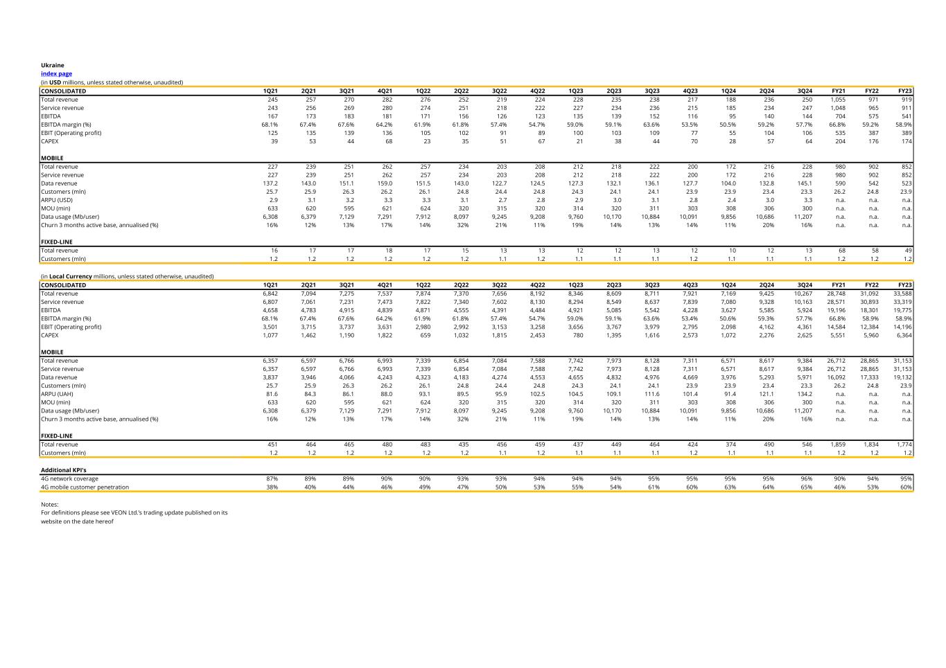 乌克兰指数页面(单位:百万美元,除非另有说明,未经审计)合并1Q21 2Q21 3Q21 4Q21 1Q22 2Q22 3Q22 4Q22 1Q23 2Q23 3Q23 4Q23 1Q24 2Q24 3Q24 FY21 FY22 FY23总收入2452572702822762522192242282352382382171882362501,055971919服务收入2432562692802742512182222272342362151852342471,048965911 EBITDA 16717318318117115612612313513915211695140144704575541 EBITDA利润率(%)68.1% 67.4% 67.6% 64.2% 61.9% 61.8% 57.4% 54.7% 59.0% 59.1% 63.6% 53.5% 50.5% 59.2% 57.7% 66.8% 59.2% 58.9%EBIT(营业利润)12513513913610510291891001031097755104106535387389 CAPEX 395344682335516721384470285764204176174 MOBILE总收入2272392392512262572342032082122182222200172216228980902852服务收入2272392392512262572342032082122182222200172216228980902852数据收入137.21 43.01 51.11 59.01 51.5143.01 22.7 124.5 127.3132.11 36.11 27.7 104.01 32.81 45.1590542523客户(mln)25.7 25.9 26.3 26.2 26.12 4.82 4.424.82 4.32 4.32 4.12 4.12 3.92 3.92 3.92 3.42 3.3 26.22 4.82 3.9 ARPU(美元)2.9 3.1 3.2 3.3 3.3 3.3 3.1 2.7 2.8 2.9 3.0 3.1 2.8 2.4 3.0 3.3 n.a. n.a. n.a. MOU(min)633620595621624320315320314320311303308308306300 n.a. n.a. n.a.数据使用量(MB/user)6,3086,3797,1297,2917,9128,0979,2459,2089,76010,17010,88410,0919,85610,68611,207 n.a. n.a. N.a.流失3个年化(%)16% 12% 13% 17% 14% 32% 21% 11% 19% 14% 13% 14% 11% 20% 16% n.a. n.a. n.a. FIXED-LINE总收入16171718171513131312121312101213685849客户(百万)1.2 1.2 1.2 1.2 1.2 1.2 1.2 1.2 1.2 1.1 1.2 1.1 1.1 1.1 1.1 1.1 1.2 1.1 1.1 1.1 1.1 1.11.1 1.2 1.2 1.2 1.2 1.2 1.2 1.2 1.2 1.2 1.2(以当地货币百万计,除非另有说明,未经审计)合并1Q21 2Q21 3Q21 4Q21 1Q22 2Q22 3Q22 4Q22 1Q23 2Q23 3Q23 4Q23 1Q24 2Q24 3Q24 3Q24 FY21 FY22 FY23总收入6,8427,0947,2757,5377,8747,3707,6568,1928,3468,6098,7117,9217,1699,42510,26728,74831,09233,588服务收入6,8077,0617,2317,4737,8227,3407,6028,1308,2948,5498,6377,8397,0809,32810,16328,5713,89333,319 EBITDA 4,6584,7834,9154,8394,8714,5554EBIT(营业利润)3,5013,7153,7373,6312,9802,9923,1533,2583,6563,7673,9792,7952,0984,1624,36114,58412,38414,196 CAPEX 1,0771,4621,1901,8226591,0321,8152,4537801,3951,6162,5731,0722,6255,5515,9606,364 MOBILE总收入6,3576,5976,7666,9937,3396,8547,0847,5887,7427,9738,1287,3116,5718,6179,38426,71228,86531,153服务收入6,3576,5976,76617,33319,132客户(百万)25.7 25.9 26.3 26.2 26.12 4.82 4.424.82 4.82 4.32 4.12 4.12 3.92 3.92 3.42 3.3 26.22 4.82 3.9 ARPU(UAH)81.68 4.386.188.09 3.189.595.9 102.5 104.5 109.11 11.6 101.49 1.41 21.11 34.2 n.a. n.a. n.a. MOU(min)6336205956216243203153203143203303308306300 n.a. n.a. n.a.数据使用量(MB/user)6,3086,3797,1297,2917,9128,0979,2459,2089,76010,17010,88410,0919,85610,68611,207 n。年化(%)16% 12% 13% 17% 14% 32% 21% 11% 19% 14% 13% 14% 11% 20% 16% n.a. n.a. N.a. FIXED-LINE总收入4514644654804834354564594374494644243744905461,8591,8341,774客户(百万)1.2 1.2 1.2 1.2 1.2 1.2 1.2 1.2 1.2 1.11.1 1.11.1 1.1 1.1 1.11.1 1.11.2 1.2 1.2 1.2 1.2额外KPI的4G网络覆盖率87% 89% 90% 90% 93% 93% 94% 94% 94% 95% 95% 95% 95% 95% 95% 96% 90% 94% 95% 4G移动客户渗透率38% 40% 44% 46% 49% 47% 50% 53% 55% 54% 61% 60%63% 64% 65% 46% 53% 60%注:有关定义,请参见VEON Ltd.于本协议日期在其网站上发布的交易更新