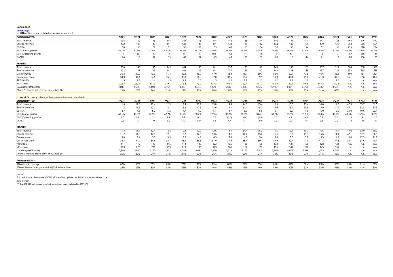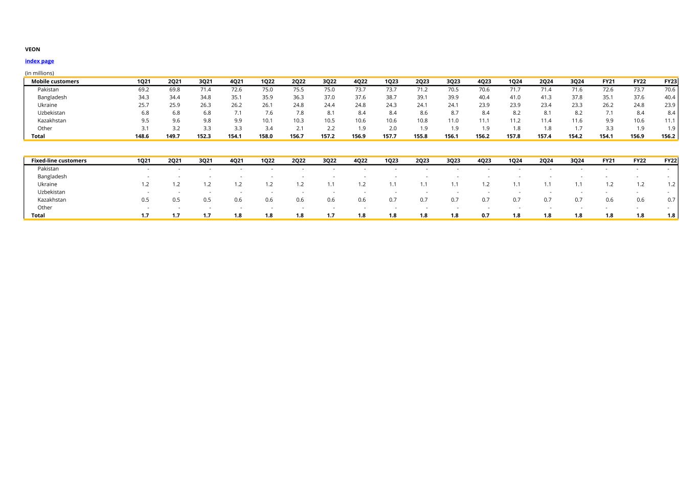 VEON指数页(百万)移动客户1Q21 2Q21 3Q21 4Q21 1Q22 2Q22 3Q22 4Q22 1Q23 2Q23 3Q23 4Q23 1Q24 3Q24 FY21 FY22 FY22 FY23巴基斯坦69.269.87 1.47 2.675.575.07 3.77 3.77 1.27 0.57 0.67 1.77 1.47 1.67 2.67 3.77 7.6孟加拉国34.33 4.43 4.83 5.13 5.9 36.337.03 7.638.73 9.13 9.94 0.44 1.04 1.33 7.83 5.13 7.64 0.4乌克兰25.7 25.9 26.3 26.2 26.12 4.82 4.424.82 4.32 4.12 4.12 3.92 3.92 3.42 3.3 26.22 4.82 3.9乌兹别克斯坦6.86.87.67.87.78.18.48.48.68.48.48.78.48.78.48.78.48.78.28.18.27.18.48.48.48.78.48.78.48.78.48.78.48.78.48.78.48.78.48。8.4哈萨克斯坦9.59.69.89.89.8 10.1 10.3 10.5 10.6 10.6 10.81 1.01 1.11 1.21 1.41 1.69.9 10.61 1.1其他3.13.2 3.3 3.3 3.4 2.1 2.2 1.9 2.0 1.9 1.9 1.8 1.8 1.7 3.3 1.9 1.9 1.9合计148.61 49.71 56.71 57.2 156.91 57.7 155.81 56.21 57.1 57.81 57.41 54.11 56.91 56.91 56.2固网客户1Q21 2Q21 3Q21 4Q21 1Q22 2Q22 2Q23 2Q23 4Q23 1Q24 2Q24 3Q24 FY21 FY22 FY22巴基斯坦-------------------------------------------------------------------------------乌克兰1.2 1.2 1.2 1.2 1.2 1.2 1.2 1.2 1.11.2 1.1 1.1 1.1 1.2 1.2 1.2乌兹别克斯坦--------------------------------------------------------------------------------------------------------------------1.8 1.7 1.8 1.8 1.8 1.8 0.7 1.8 1.8 1.8 1.8 1.8 1.8
