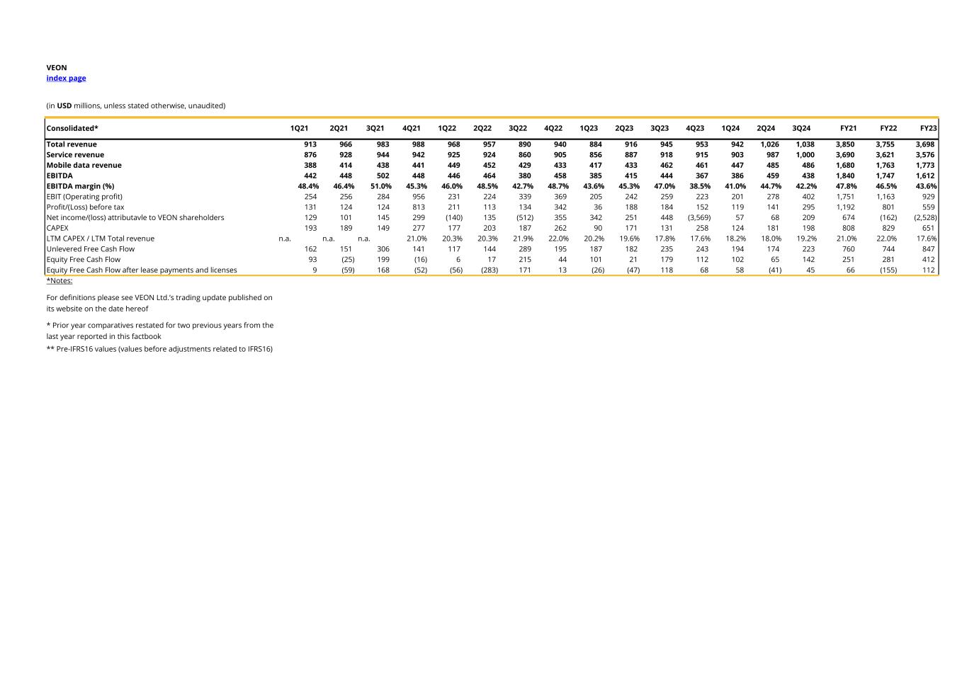 VEON索引页面(单位:百万美元,除非另有说明,未经审计)合并*1Q21 2Q21 3Q21 4Q21 1Q22 2Q22 3Q22 4Q22 1Q23 2Q23 3Q23 4Q23 1Q24 2Q24 3Q24 FY21 FY22 FY23总收入9139669839889689578909408849169459539421,0261,0383,8503,7553,698服务收入8769289449429259248609058568879189159039871,0003,6903,6213,576移动数据收入3884144384414494524294334174334624614474854861,6801,7631,773 EBITDA 44244850244844646438045838545415444367386459EBITDA利润率(%)48.4% 46.4% 51.0% 45.3% 46.0% 48.5% 42.7% 48.7% 43.6% 45.3% 47.0% 38.5% 41.0% 44.7% 42.2% 47.8% 46.5% 43.6% EBIT(营业利润)254256284956231224339369205242292232012784021,7511,163929利润/(亏损)税前13112412481321111313434236188184152119141251,192801559归属于VEON股东的净收入/(亏损)129101145299(140)135(512)3553422151448(3,569)5768209674(162)(2,528)CAPEX 193189149277177203187262901711131258124181198808829651 LTM CAPEX/LTM总收入n.a. n.a. 21.0% 20.3% 20.3% 21.9% 22.0% 20.2% 19.6% 17.8% 17.6% 18.2% 18.0% 19.2% 21.0% 22.0% 17.6%无杠杆自由现金流162151306141117144289195187182235243194174223760744847股权自由现金流93(25)199(16)617215441012117911210265142251281412扣除租赁付款后的股权自由现金流及牌照9(59)168(52)(56)(283)17113(26)(47)1186858(41)4566(155)112*注:有关定义,请参见VEON Ltd.于本协议发布之日在其网站上发布的交易更新*与本概况介绍中报告的上一年相比,重述了前两年的上一年比较数据**IFRS16之前的值(与IFRS16相关的调整前的值)