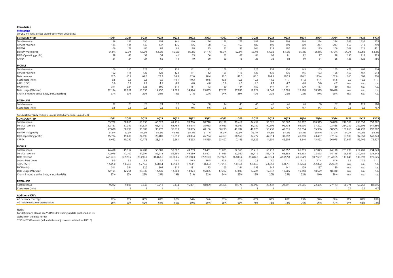 哈萨克斯坦指数页面(单位:百万美元,除非另有说明,未经审计)合并1Q21 2Q21 3Q21 4Q21 1Q22 2Q22 3Q22 4Q22 1Q23 2Q23 3Q23 4Q23 1Q24 2Q24 3Q24 FY21 FY22 FY23总收入12813715015414116169175188204208214224224569636775服务收入124134145147136155160163169182 19920921717550613749 EBITDA 66728683688858292104118107118125106307321421 EBITDA利润率(%)51.5% 52.3% 57.6% 54.2% 46.5% 55.3% 51.1% 48.3% 52.5% 55.4% 57.6% 51.5% 55.3% 55.8% 47.3% 54.0% 50.4% 54.3%EBIT(营业利润)384658544163565267849281929778196212325 CAPEX 212424661419395016263392193156135122166 MOBILE总收入10611512813013011112109115123139136145163155478462514服务收入1021111231241111112109115123136145163155459457514数据收入57.565.26 9.37 3.27 4.37 2.678.476.58 1.088.0 104.1102.91 10.21 13.4 107.6 265265302376 Customers(mln)9.59.69.89.89.8 10.1 10.3 10.5 10.5 10.6 10.6 10.81 1.01 1.11 1.21 1.41 1.69.9 10.61 1.1 ARPU(USD)3.6 3.9 4.24.14.14.04.04.0 3.84.04.34.7 4.74.85.0 4.7 n.a. n.a. n.a. n.a. MOU(min)311334326309314181173160145152147141129137130 n.a. n.a. n.a.数据使用量(MB/user)12,19412,26113,33014,30314,97415,83517,20717,89317,22417,54718,50519,11818,52918,410 n.a. n.a. n.a年化(%)27% 20% 22% 21% 19% 21% 22% 24% 25% 19% 20% 25% 22% 19% 20% n.a. n.a.固定线路总收入22232324123638444346454648505791129180客户(百万)0.5 0.5 0.5 0.6 0.6 0.6 0.6 0.6 0.6 0.7 0.7 0.7 0.7 0.7 0.7 0.7 0.7 0.6 0.6 0.6 0.7(以当地货币百万计,除非另有说明,未经审计)合并1Q21 2Q21 3Q21 4Q21 1Q22 2Q22 3Q22 4Q22 1Q23 2Q23 3Q23 4Q23 1Q24 2Q24 3Q24 FY21 FY22 FY23总收入53,70258,85563,93066,02264,43670,71678,71079,19679,41784,45293,02696,66796,397100,315106,830242,509293,057353,562服务收入52,16757,34961,62463,11961,76968,61475,93376,08076,94781,78090,39592,73493,99697,202103,468234,259282,396341,856 EBITDA 27,678EBIT(营业利润)15,77419,63824,69523,40118,69028,03426,76424,36330,56037,77742,0 1437,89241,25043,46737,18483,50897,851148,243 CAPEX 8,65210,23210,17328,6116,5618,26318,53523,4077,14311,62514,95442,2058,34613,82226,97557,66756,76675,927移动总收入44,49049,15754,28255,80959,00249,28953,40151,08952,36055,41263,41863,35265,39372,87374139,092171,625订户(百万)9.59.69.89.89.9 10.1 10.3 10.5 10.6 10.6 10.6 10.81 1.01 1.11 1.21 1.41 1.69.9 10.61 1.1 ARPU(KZT)1,501.01,658.81,776.91,781.41,818.21,763.11,896.31,791.91,819.41,936.32,147.22,167.12,176.42,236.22,223.9 n.a. n.a. n.a. MOU(min)311334326309314181173160144152147141129137130 n.a. n.a.数据使用量(MB/user)12,19412,26113,33014,43014,30314,97415,83517,207年化(%)27% 20% 22% 21% 19% 21% 22% 24% 25% 19% 20% 25% 22% 19% 20% n.a. n.a. n.a. FIXED-LINE总收入9,2129,6989,64810,2135,43415,89118,07920,35419,77620,49220,43721,39121,56622,48527,17338,77159,75882,095客户(百万)11111111111111.6 0.6 0.7额外KPI的4G网络覆盖率77% 79% 80% 81% 82% 84% 86% 87% 88% 88% 89% 89% 89% 90% 90% 81% 87% 89% 4G移动客户渗透率56% 59% 62% 64% 66% 69% 68%76% 76% 77% 64% 68% 73%注:有关定义,请参见VEON Ltd.于本协议发布之日在其网站上发布的交易更新**IFRS16之前的值(与IFRS16相关的调整前的值)
