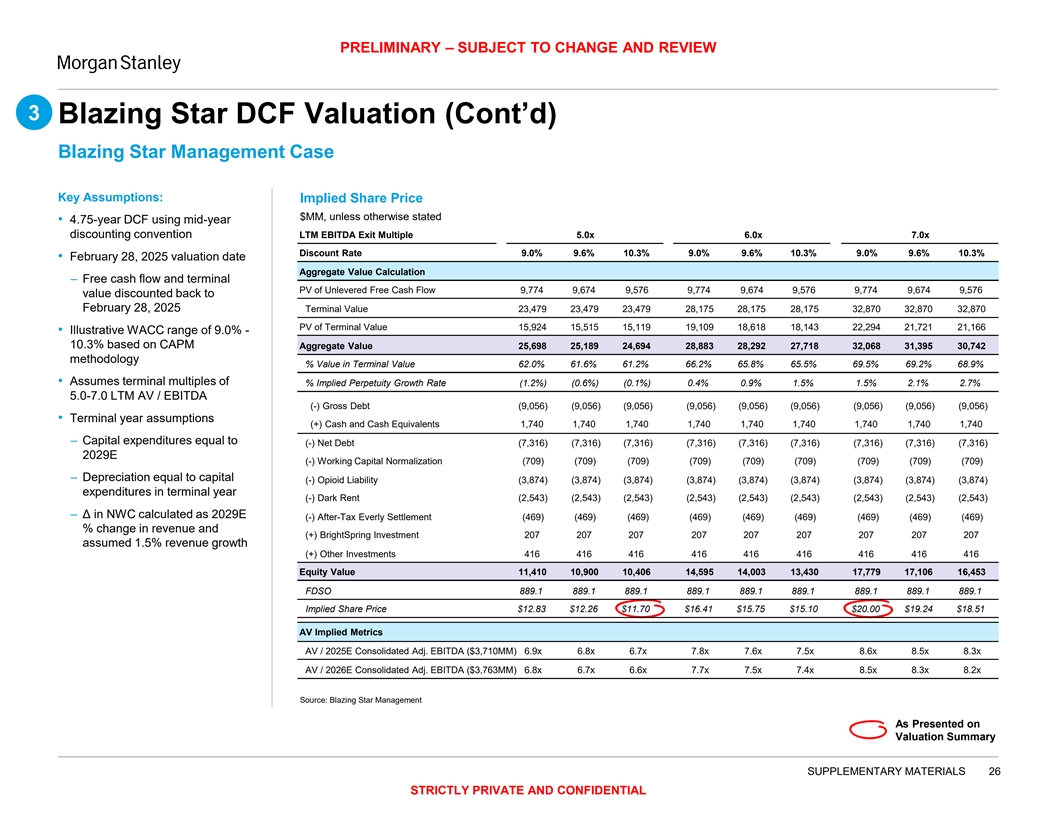 [***]表示根据经修订的1934年《证券交易法》第24b-2条规定的保密处理请求,信息已被遗漏。这份初步–可能更改和审查的信息已分别提交给美国证券交易委员会。3 Blazing Star DCF估值Blazing Star Management案例关键假设:无杠杆自由现金流建立$ mm,除非另有说明•终端年度假设Q2-Q4 2025E 2026E 2027E 2028E 2029E终端–资本支出等于8/31/20258/31/20268/31/20278/31/20288/31/2029年度2029E收入115,146149,874155,917161,197166,548166,548 –折旧等于资本%增长(3.0)% 4.0% 3.4% 3.3%终端年度支出(1)合并调整后EBITDA 2,7503,7634,1364,4424,6964,696 – NWC中的μ计算为2029E % EBITDA利润率2.4% 2.5% 2.7% 2.8% 2.8% 2.8% 2.8%收入变化和(-)折旧(1,116)(1,560)(1,569)(1,591)(1,612)(1,176)假设收入增长1.5%(-)股票薪酬(144)(259)(274)(286)(297)(297)(2)(264)(215)(163)(125)(114)(114)(-)非公认会计准则现金支出调整后EBITA,不包括非美国通用会计准则费用1,2261,7282,1302,4412,6723,108(-)现金税(259)(327)(481)(552)(604)(703)%税率21.1% 18.9% 22.6% 22.6% 22.6% 22.6% NOPAT 9671,4021,6481,8892,0682,406(+)折旧1,1161,5601,5691,5911,6121,176(-)资本支出(859)(1,163)(1,210)(1,172)(1,176)(+)(增加)/减少NWC 1,727527194(54)(30)(14)[***](+)Cencora货币化307286------(+)Cencora AOI净股息(98)--------(+)税后非暗租金ROU租赁资产(33)(33)(18)-----(+)税后法律和解(不包括。阿片类药物和艾维利)(173)(20)(19)-----[***](-)英国养老金缴款--(437)-----(3)141(109)(57)----(-)其他无杠杆自由现金流3,1741,8621,8762,1792,3992,317资料来源:Blazing Star Management注:减值和其他成本1。调整后EBITDA假设VMD Markets、Summit和CityMD 100%所有权,默认3。包括VFP mark to market、其他金库和关联现金流、租赁收购、Anti-under VillageMD从Blazing Star获得的担保贷款以及随后的宽容协议。稀释性股票回购、融资租赁的融资现金流以及FX2。包括法律、遣散费、顾问、转型成本管理、收购、补充材料25严格私人和保密