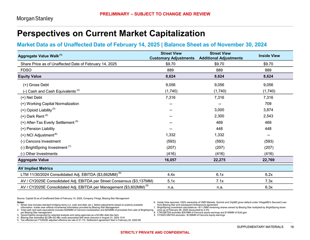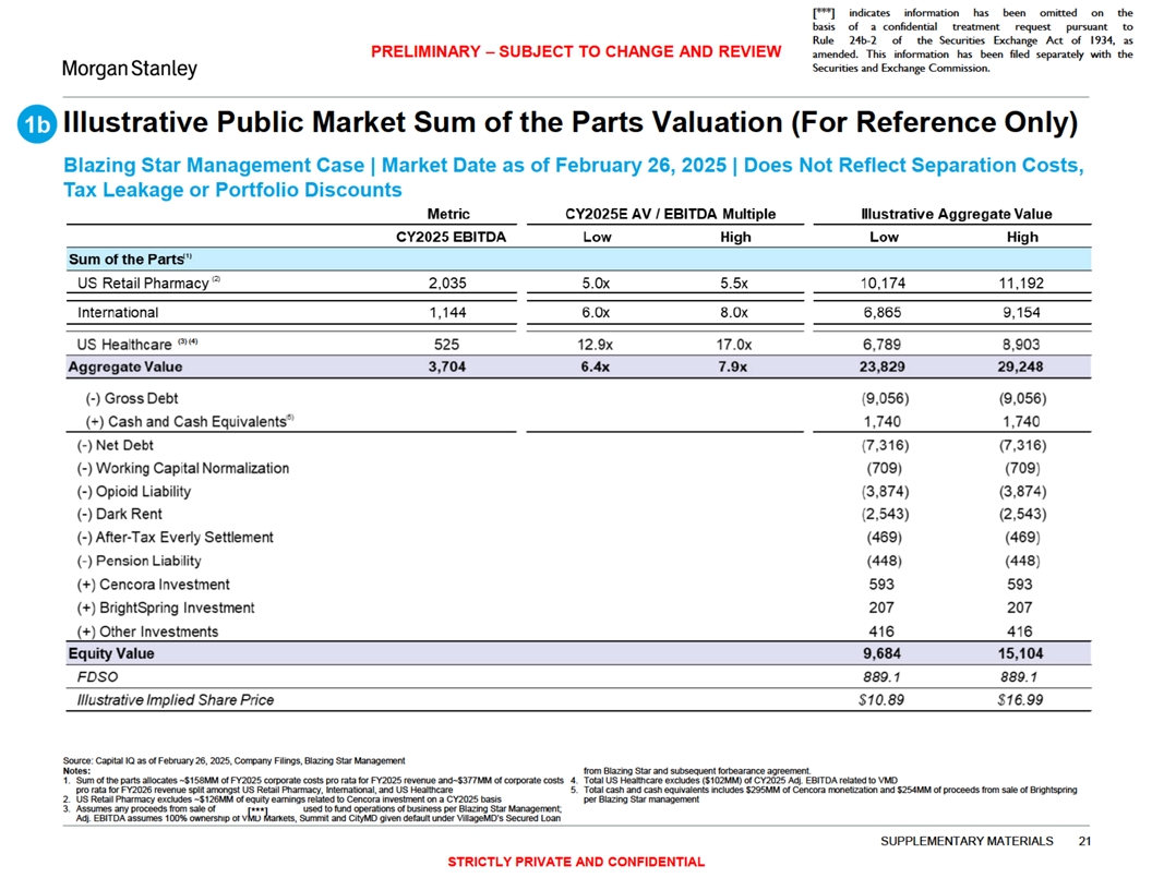 初步–须予更改及检讨截至2025年2月14日未受影响日期的现行市值市场数据透视|截至2024年11月30日的资产负债表街景街景(1)总价值步行内景习惯调整额外调整截至2月14日未受影响日期的股价,2025 $ 9.70 $ 9.70 $ 9.70 FDSO 889889889股权价值8,6248,6248,624(+)总债务9,0569,0569,056(2)(-)现金和现金等价物(1,740)(1,740)(1,740)(+)净债务7,3167,3167,316(+)营运资金正常化---709(3)(+)类阿片负债--3,0003,874(4)--2,3002,543(+)暗租金(5)(+)税后Everly结算--469469(+)养老金负债--448448(6)1,3321,332--(+)NCI调整(-)Cencora Investment(593)(593)(593)(7)(-)BrightSpring Investment(207)(207)(207)(-)其他投资(416)(416)总价值16,05722,27522,7($ 3,137mm)5.1x 7.1x 7.3x(9)AV/CY2025E每管理层合并调整后EBITDA($ 3,602mm)n.a. n.a. 6.3x资料来源:Capital IQ截至2025年2月14日未受影响日期,公司备案,Blazing Star Management注:6。根据VillageMD的担保贷款1,Inside View承担了VMD Markets、Summit和CityMD的100%所有权,并已发生违约。街景包括标准的过渡项目(即现金和债务等)。选择调整基于公开可从Blazing Star和后续的宽限协议信息。内部视图反映了由Blazing Star Management 7提供的增量信息。BrightSpring投资计算得出,Blazing Star拥有的剩余股份约为11.2mm美元,乘以BrightSpring股份2。现金和现金等价物总额包括2.95亿美元的Cencora货币化和截至2025年2月26日出售Brightspring价格的2.54亿美元收益,每Blazing Star Management 8折让4.5%。LTM EBITDA不包括3.51亿美元的Cencora股权收益和1.49亿美元的SLB收益3。被选定的分析师和评级机构认定为30亿美元的类债务项目9的类阿片负债。CY2025 EBITDA不包括约1.26亿美元的Cencora股权收益4。Blazing Star估计,2024年8月31日10-K5与商店关闭相关的成本为22亿美元至24亿美元。每FY2025E调整后有效税率21.1%受影响的税收。2025年2月25日提交的和解协议8K补充材料16严格保密